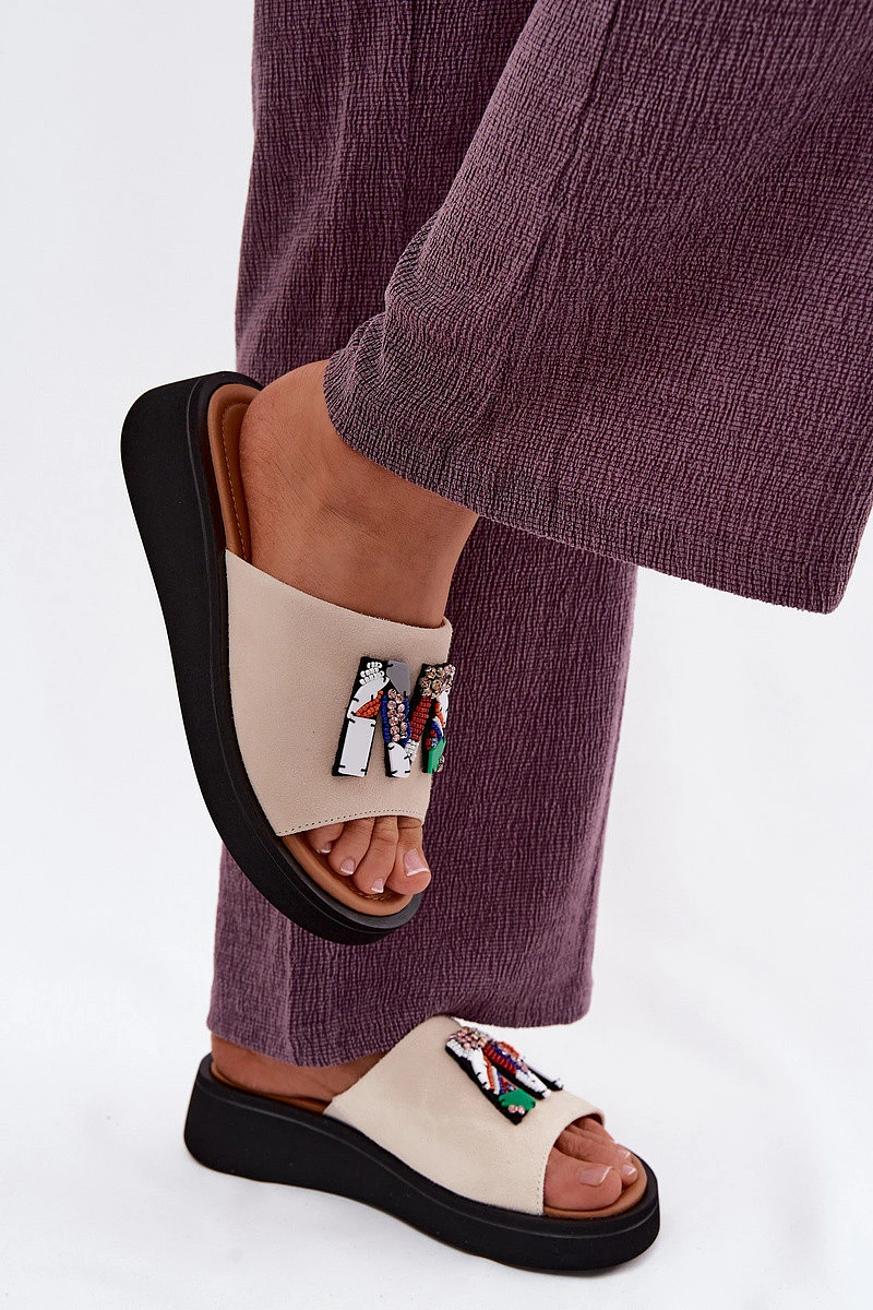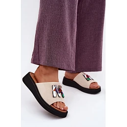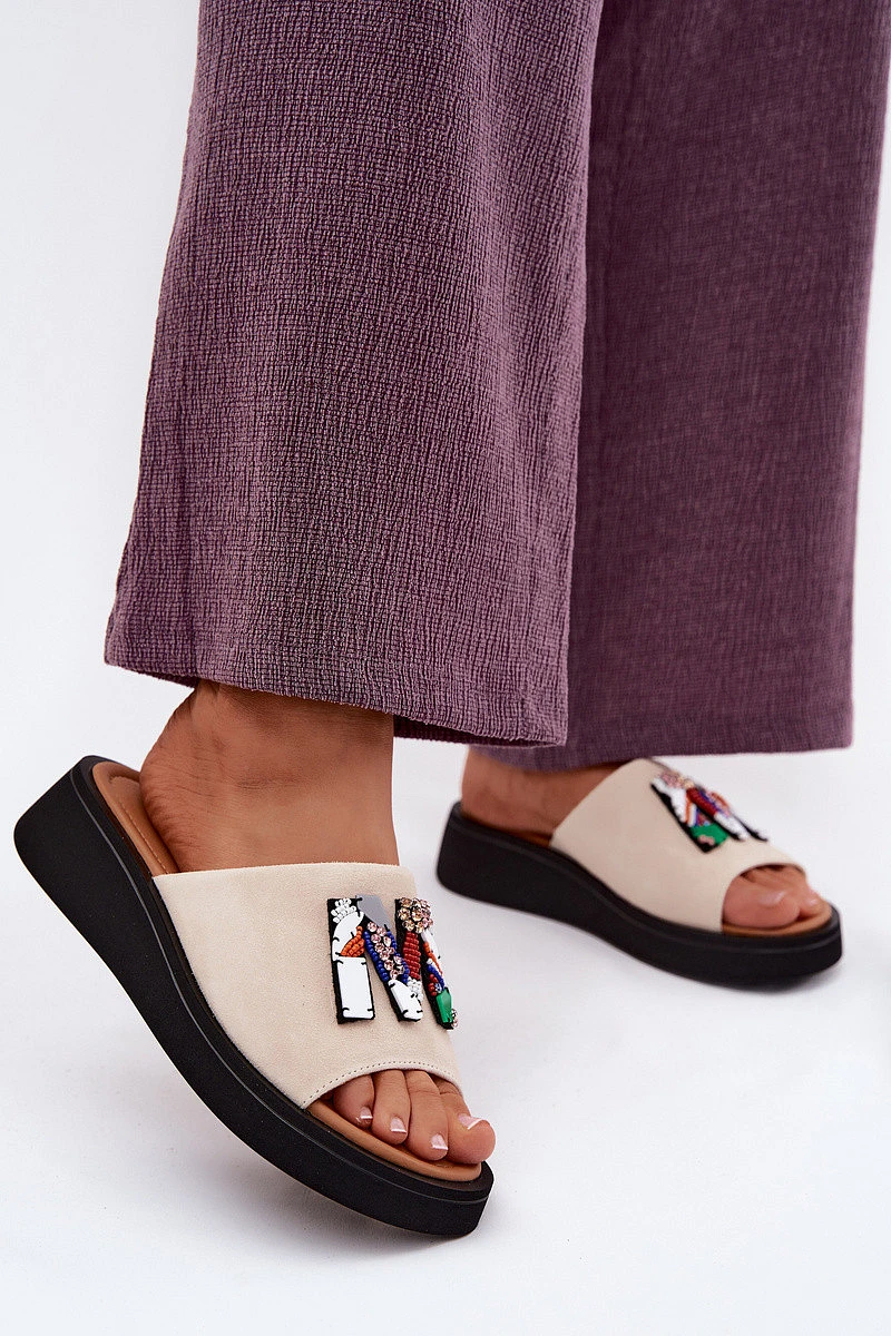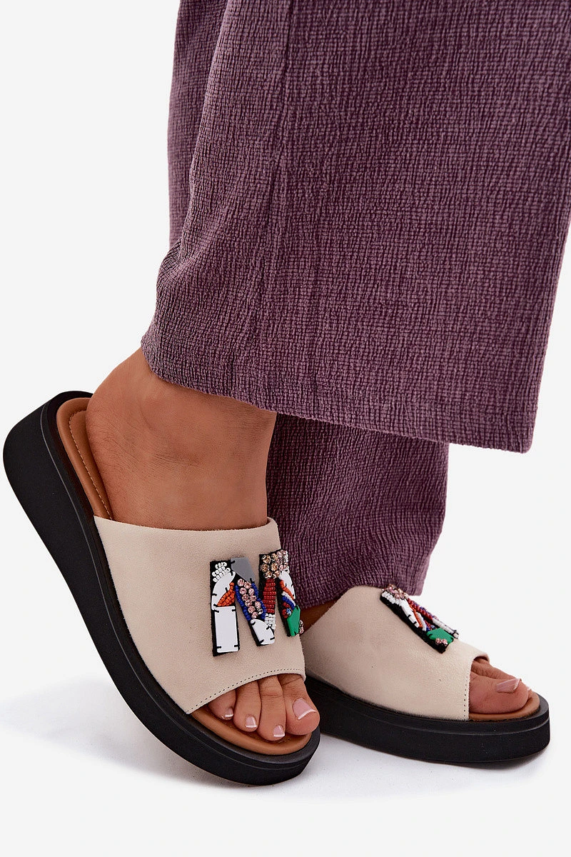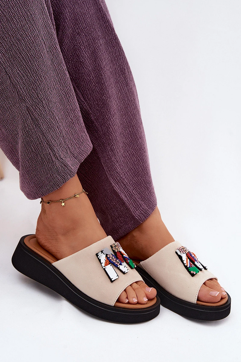 Kožené semišové dámské pantofle s ozdobou na platformě Vinceza 66942 béžové