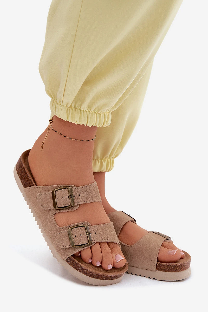 Přidání recenze k Kožené semišové dámské pantofle s přezkami tmavě béžové model 22125558 - Boto
