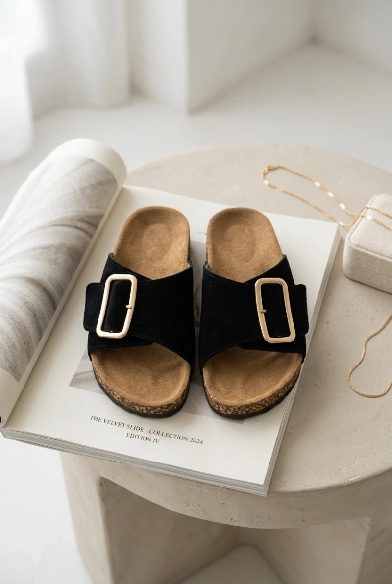 Dámské nazouváky z přírodního semiše na korkové podešvi jsou pohodlnou a stylovou volbou na teplé dny. Zlatá přezka tvoří elegantní akcent, který přitahuje pozornost a dodává celkovému vzhledu charakter. Profilovaná vložka zajišťuje komfort při nošení, díky čemuž je model vhodný i na celý den. Ideální na letní výlety, každodenní vycházky, nákupy nebo procházky – všude tam, kde je důležitá pohodlí a módní vzhled. Při výběru velikosti se řiďte tabulkou velikostí.