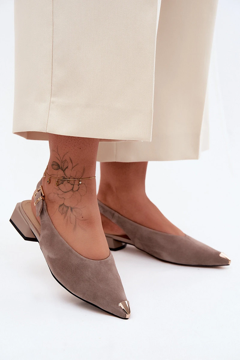 Dámské sandály z přírodního semiše jsou elegantní a stylovou volbou pro různé příležitosti. Klasický tvar v kombinaci se špičatými nosky dodává celku štíhlý vzhled a zdůrazňuje ženský charakter stylizace. Nízký podpatek ve tvaru kostky zajišťuje stabilitu a pohodlí při chůzi, což dělá model vhodným i na delší nošení. Vepředu je dekorativní prvek, který přitahuje pozornost a dodává celku výjimečný akcent. Kožená vložka zvyšuje komfort nošení a nastavitelné pásky s přezkou umožňují přizpůsobení tvaru nohy. Ideální volba na schůzky, slavnosti nebo elegantní výlety, když záleží na stylu a pohodlí. Při výběru velikosti se řiďte tabulkou velikostí.