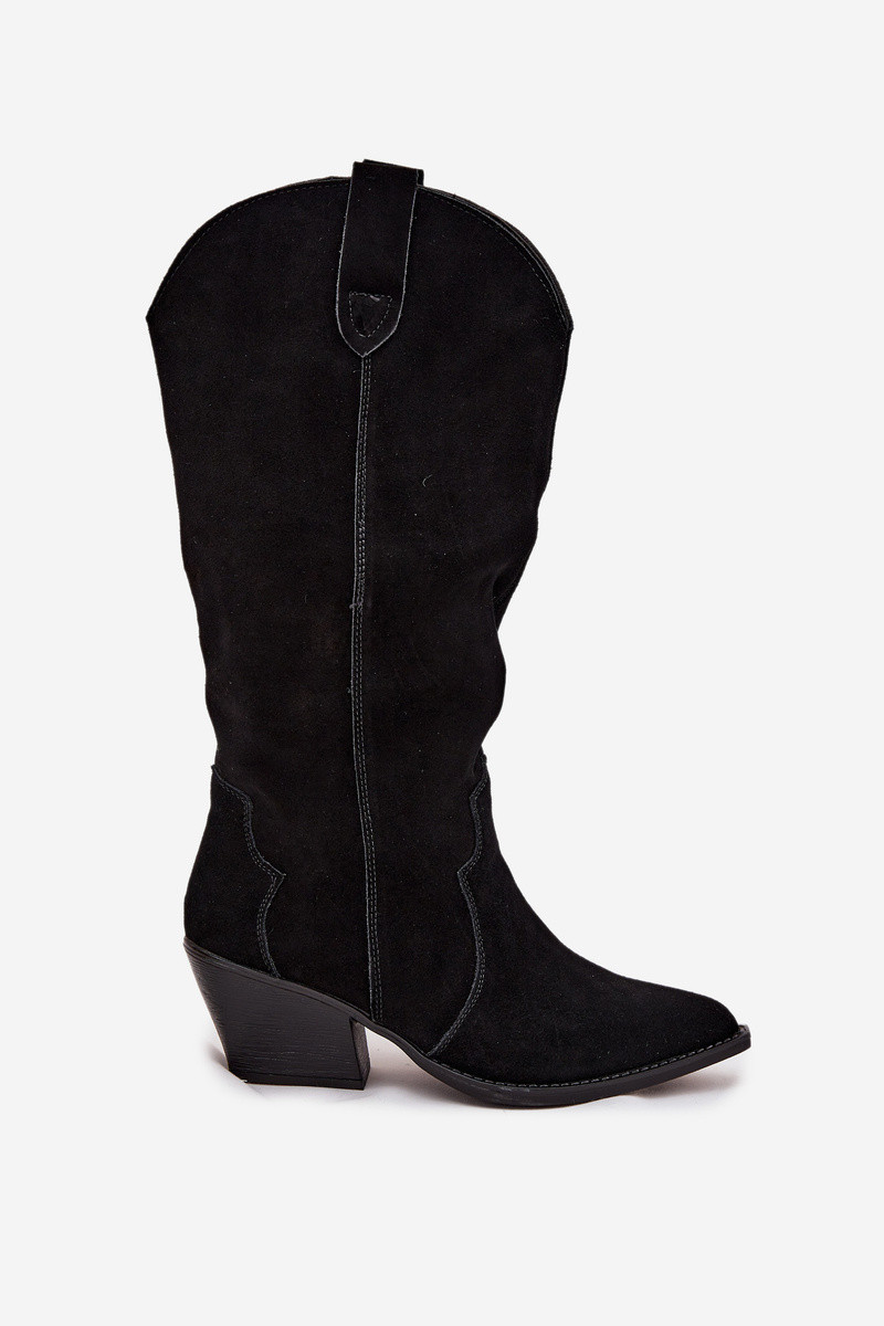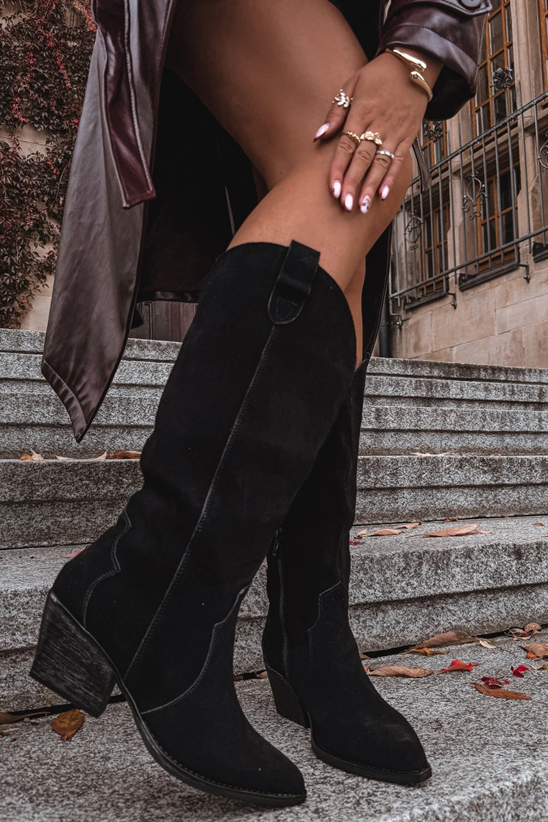 Kožené cowboy boty vyrobené z vysoce kvalitního přírodního semiše jsou ideční volbou pro ženy, které ocení spojení elegance a módního charakteru. Jejich jedinečný design inspirovaný západním stylem činí z nich působivý prvek každého outfitu. Model s vkládáním a zipem na spodní části holínky usnadňuje obouvání a sundávání, přičemž zachovává elegantní tvar. Umístěny na stabilním, zúženém podpatku typu sloup, zajišťují pohodlí při chůzi a zároveň lehce zeštíhlují nohy a dodávají postavě lehkost. Špičaté nosy zdůrazňují ženský charakter obuvi, dodávají jí elegantní výraz. Vnitřek kozaček je vyhřátý měkkým kožešinovým límcem, který zaručuje tepelný komfort i v chladnějších dnech. Výborně se hodí k šatům, sukním i úzkým kalhotám. Při výběru velikosti se prosím řiďte tabulkou velikostí. Při výběru velikosti se řiďte tabulkou velikostí.