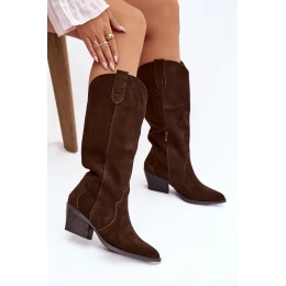 Kožené cowboy boty vyrobené z vysoce kvalitního přírodního semiše jsou ideční volbou pro ženy, které ocení spojení elegance a módního charakteru. Jejich jedinečný design inspirovaný západním stylem činí z nich působivý prvek každého outfitu. Model s vkládáním a zipem na spodní části holínky usnadňuje obouvání a sundávání, přičemž zachovává elegantní tvar. Umístěny na stabilním, zúženém podpatku typu sloup, zajišťují pohodlí při chůzi a zároveň lehce zeštíhlují nohy a dodávají postavě lehkost. Špičaté nosy zdůrazňují ženský charakter obuvi, dodávají jí elegantní výraz. Vnitřek kozaček je vyhřátý měkkým kožešinovým límcem, který zaručuje tepelný komfort i v chladnějších dnech. Výborně se hodí k šatům, sukním i úzkým kalhotám. Při výběru velikosti se prosím řiďte tabulkou velikostí. Při výběru velikosti se řiďte tabulkou velikostí.