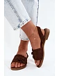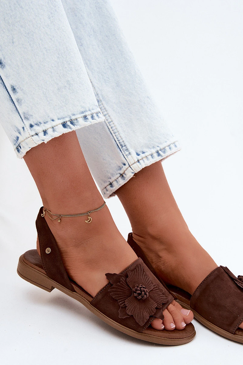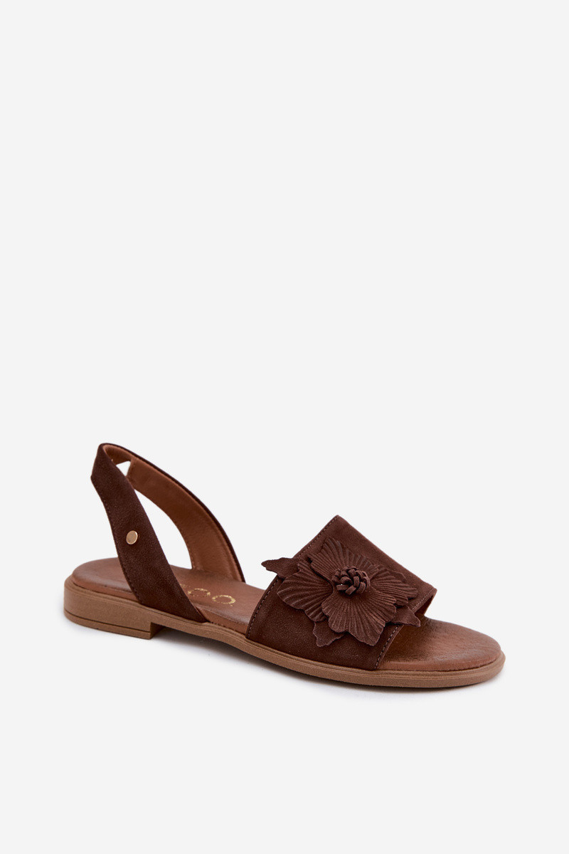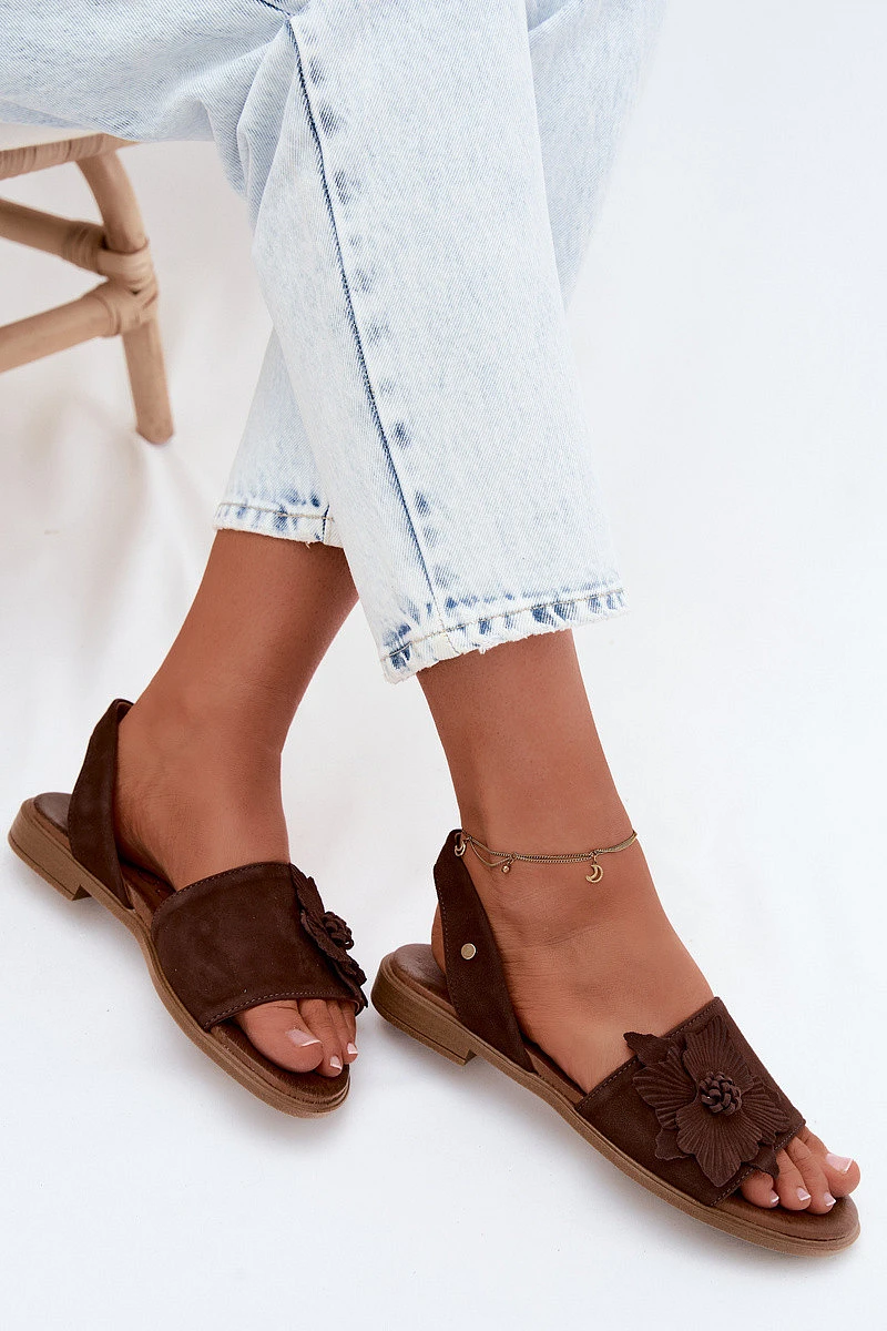 Kožené semišové sandály na nízkém podpatku s ozdobným květem Zazoo 407471 Čokoládové