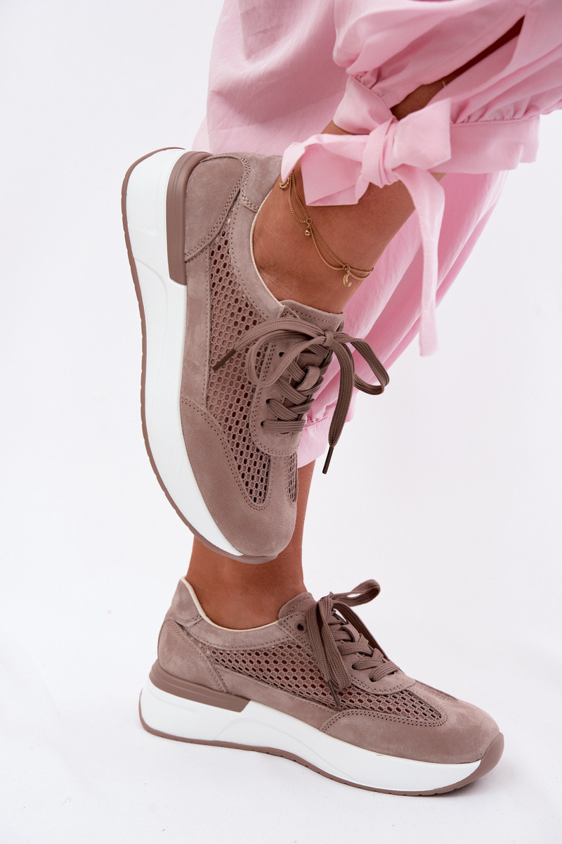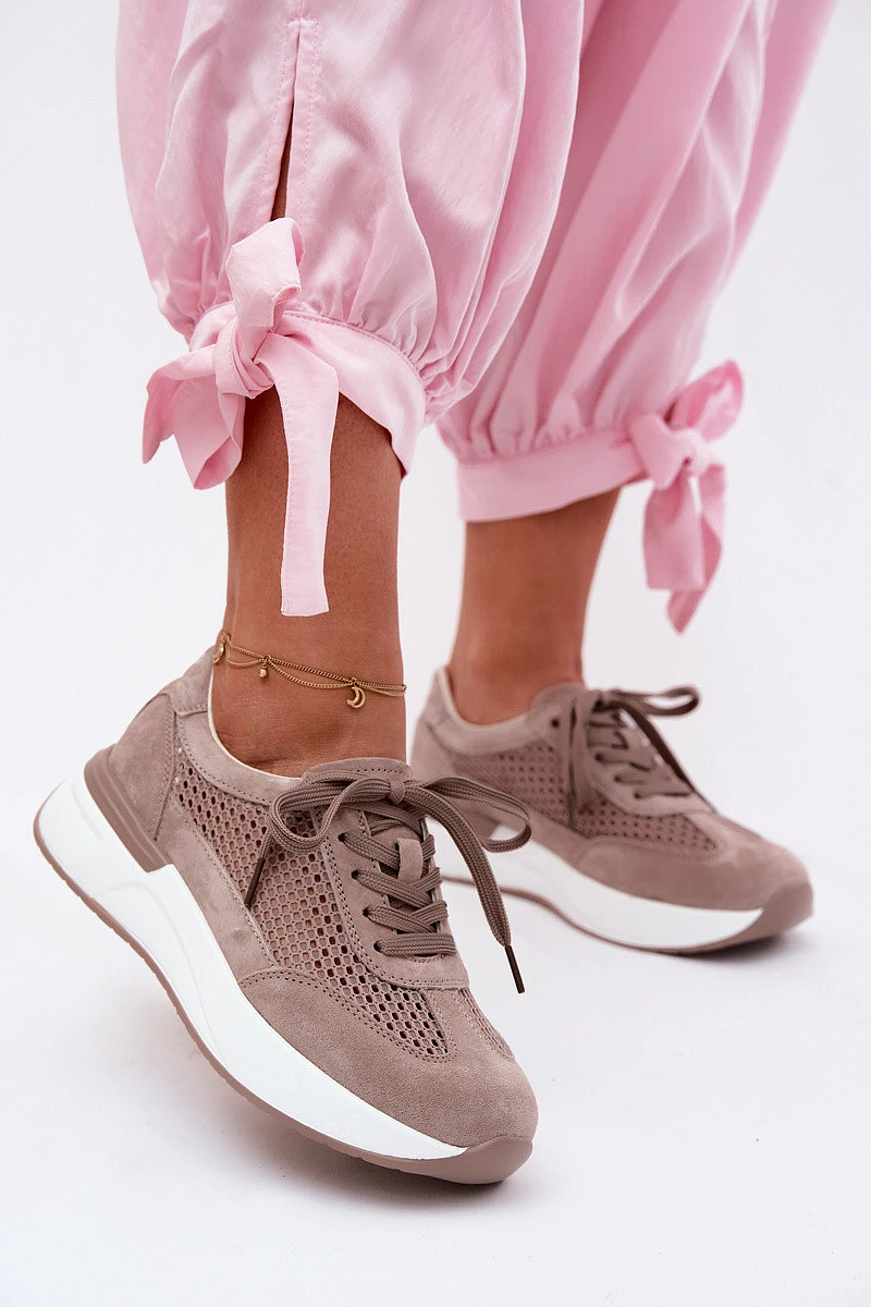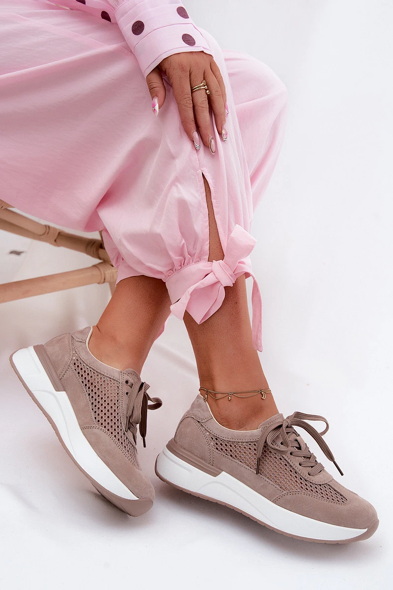Dámské síťované tenisky z pravé semišové kůže a síťoviny jsou spojení pohodlí a moderního stylu. Umístěné na platformě, která opticky zeštíhluje siluetu. Lehká, prodyšná svrchní část činí tento model ideální pro teplejší dny, zajišťující pohodlí po celý den. Kombinace různých materiálů jim dodává módní charakter a klasické šněrování umožňuje dobré přizpůsobení noze. Vložka typu comfort shoes zvyšuje pohodlí při nošení, dbá o komfort na každém kroku. Ideální volba na každodenní nošení – pro aktivní styl, procházky a městské výlety, kdy je důležitý pohodlí a styl. Při výběru velikosti se řiďte tabulkou velikostí.