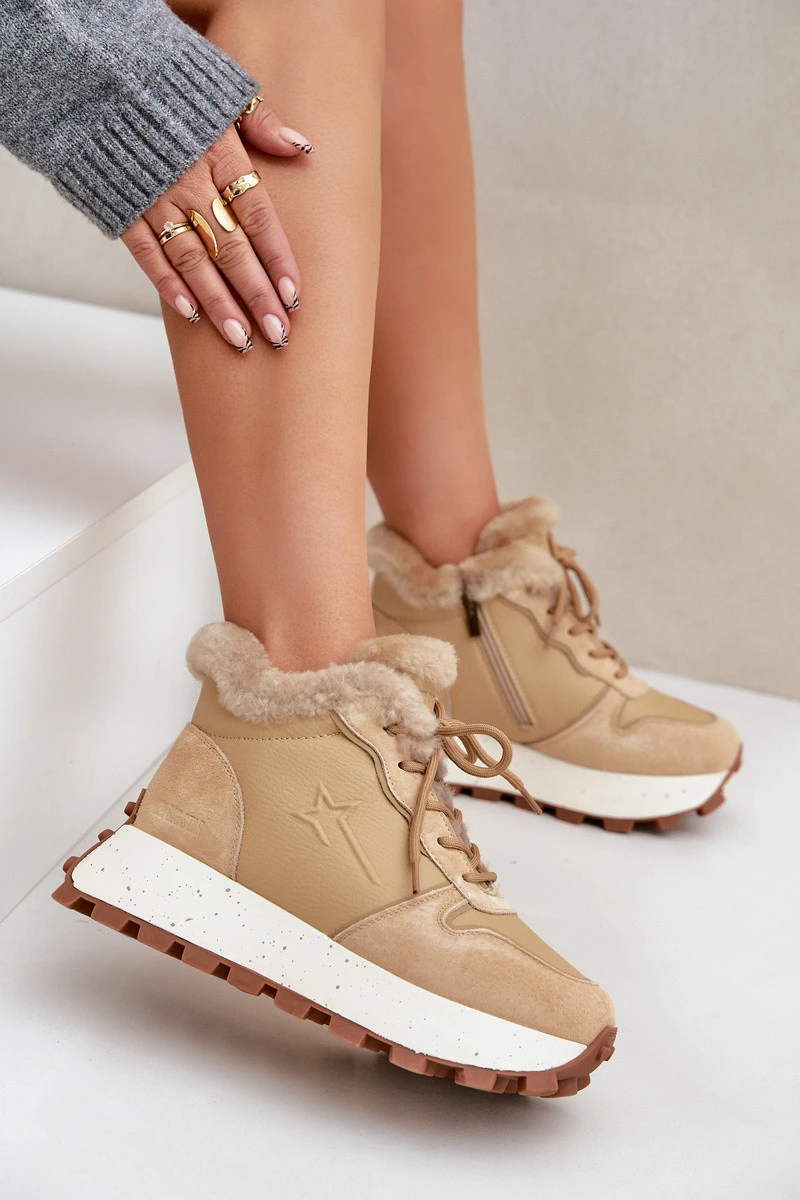 Kožené Sneakersy Trapery Dámské S Kožíškem Na Platformě Big Star OO274A330 Béžové