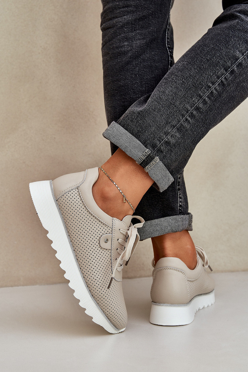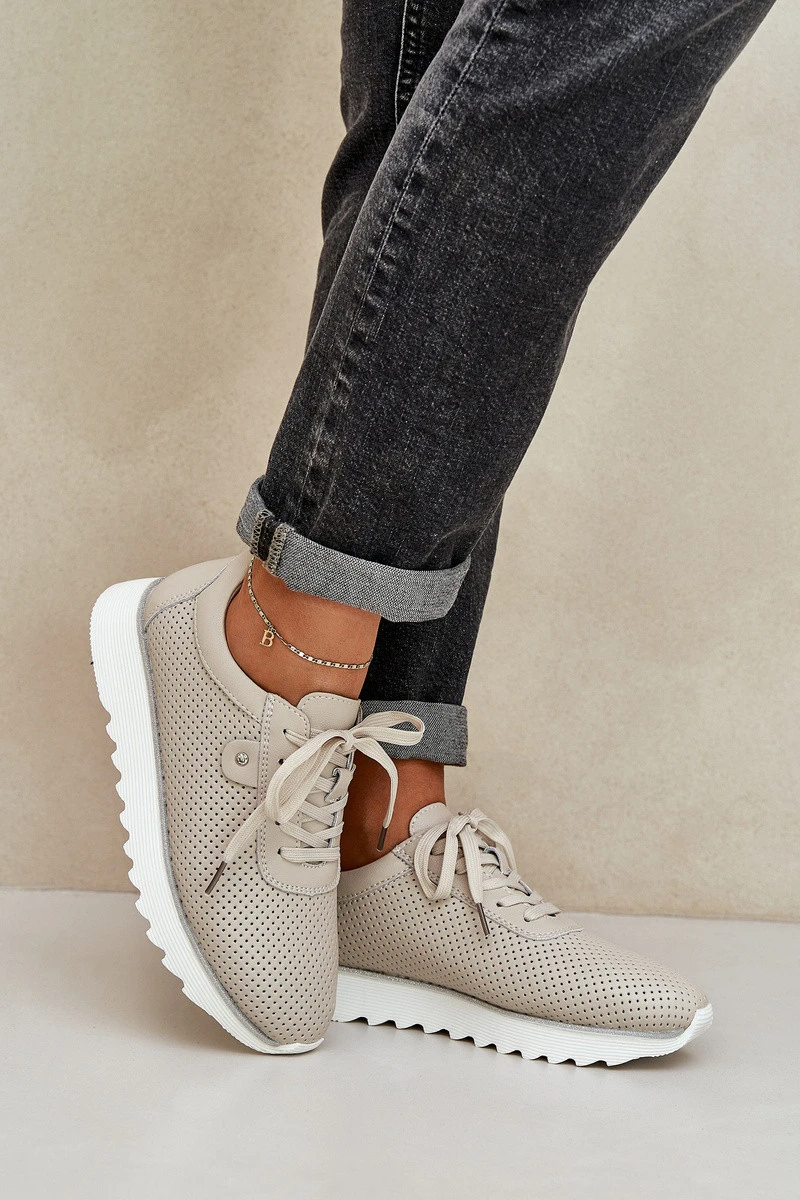 Dámské sportovní boty z přírodní kůže spojují eleganci a pohodlí. Umístěné na platformě s jemným třpytem, dodávají každé stylizaci lesk. Lehká a pohodlná, zajišťují komfort po celý den. Kožená stélka zaručuje odpovídající odpružení a pohodlí při nošení. Tyto boty budou skvělou volbou na každodenní nošení, spojující módní vzhled s funkčností. Při výběru velikosti se řiďte tabulkou velikostí.