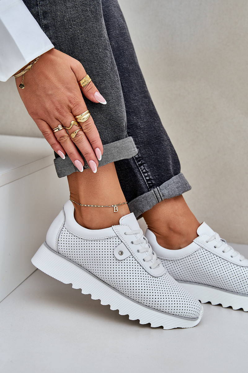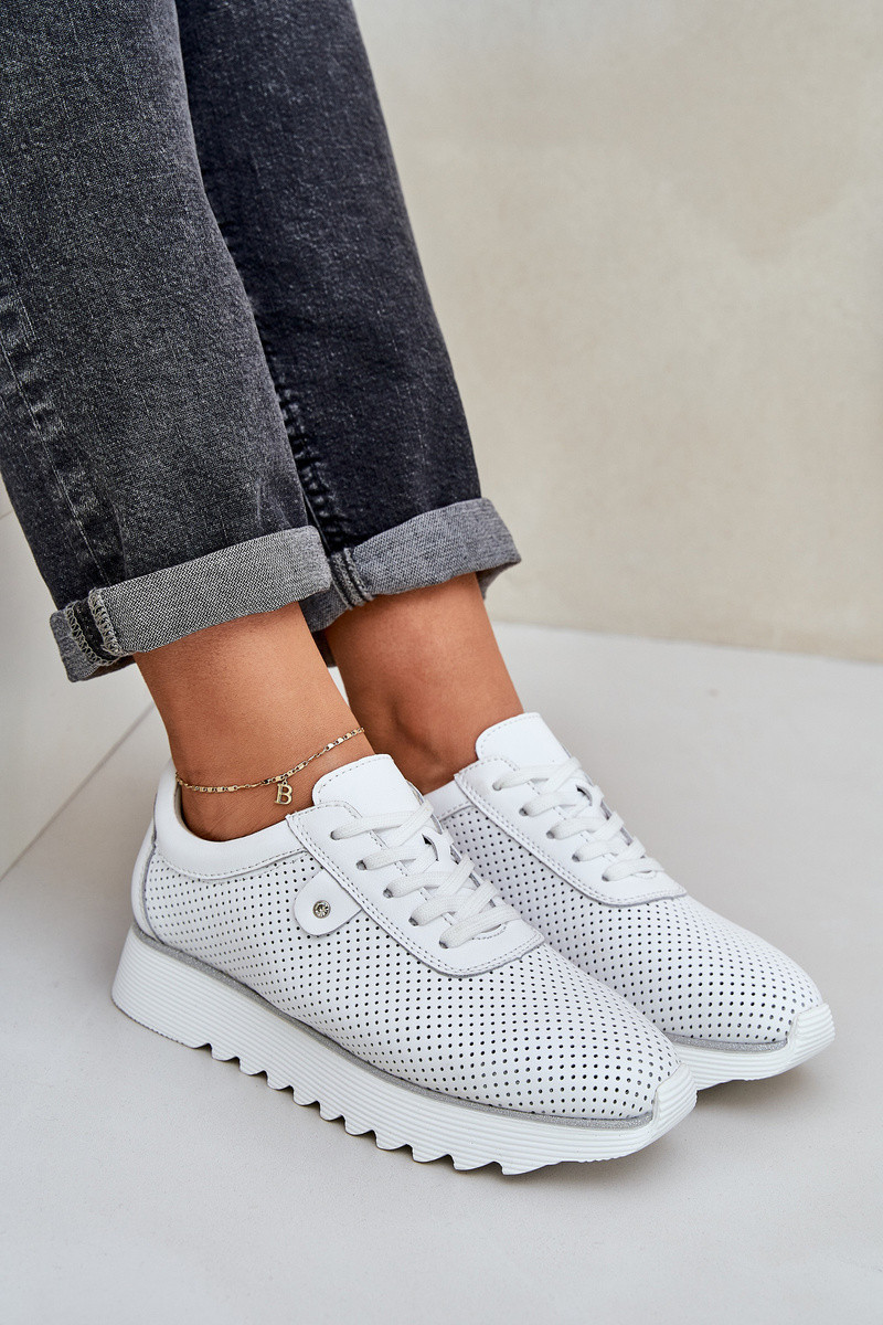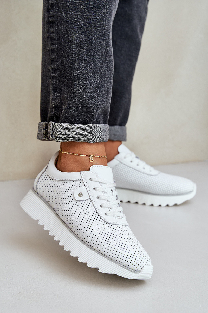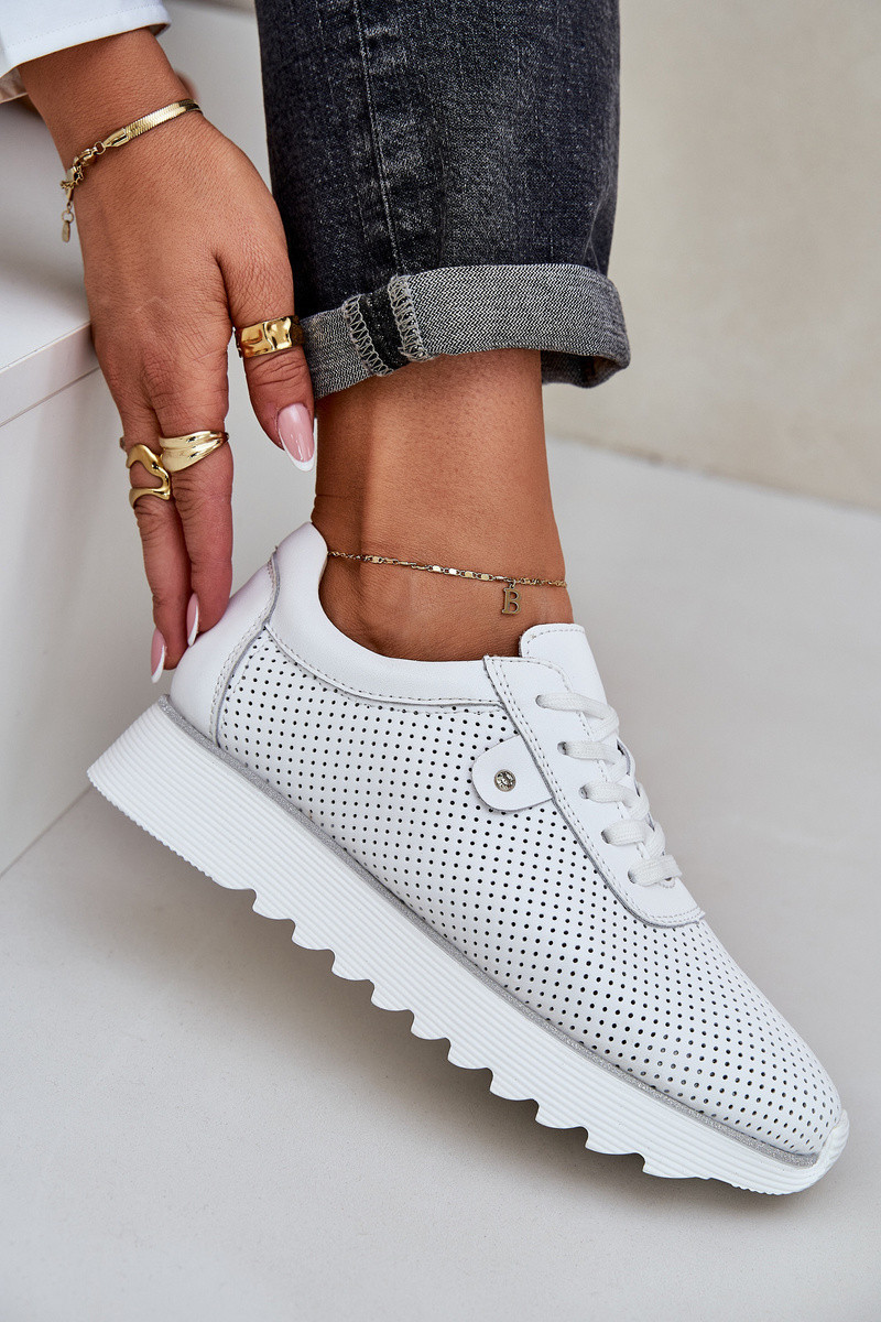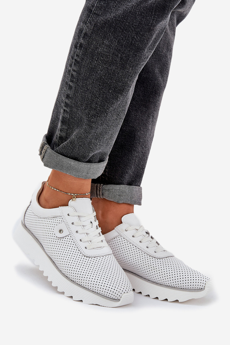 Dámské sportovní boty z přírodní kůže spojují eleganci a pohodlí. Umístěné na platformě s jemným třpytem, dodávají každé stylizaci lesk. Lehká a pohodlná, zajišťují komfort po celý den. Kožená stélka zaručuje odpovídající odpružení a pohodlí při nošení. Tyto boty budou skvělou volbou na každodenní nošení, spojující módní vzhled s funkčností. Při výběru velikosti se řiďte tabulkou velikostí.