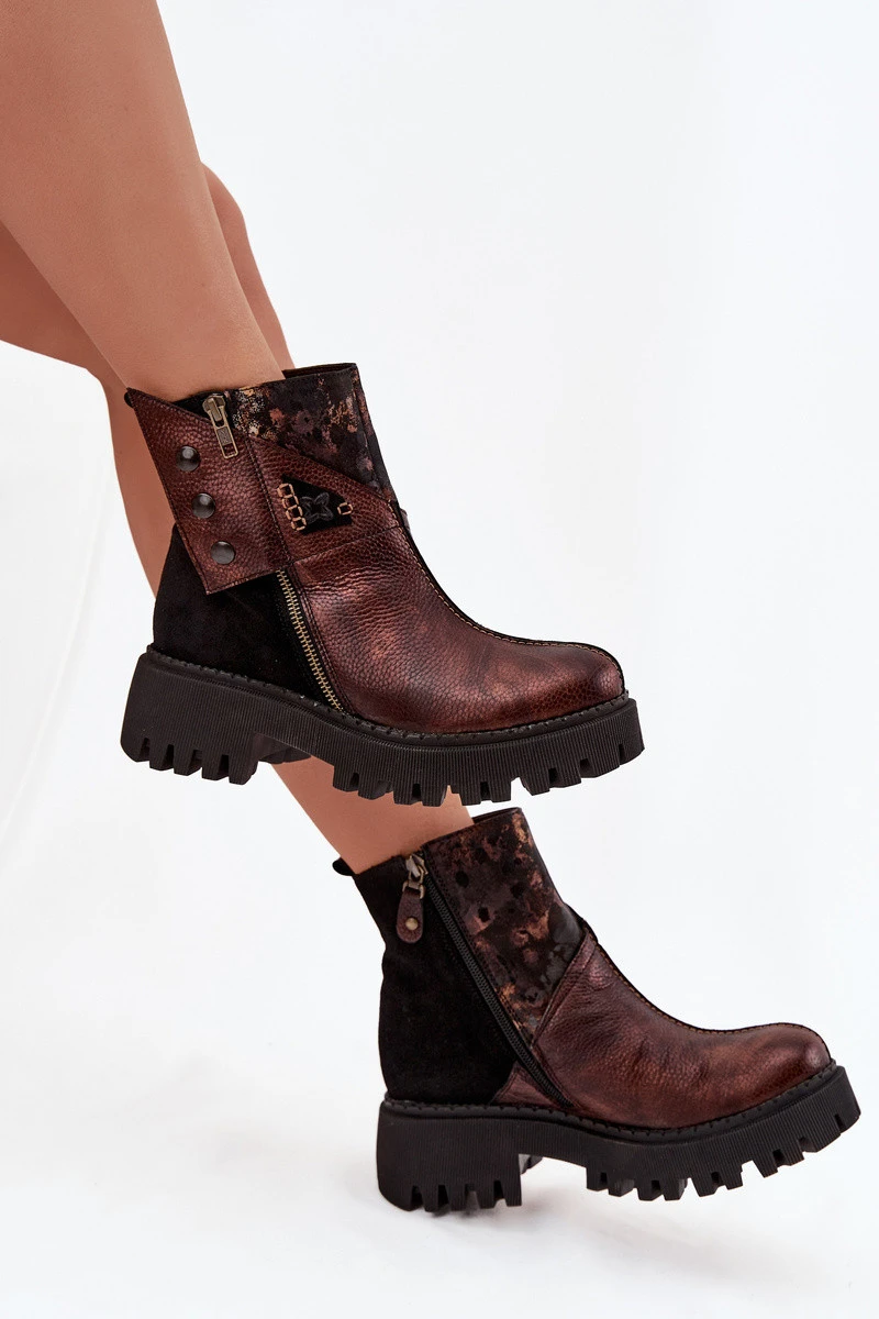 Dámské boty značky Maciejka, vyrobené z vysoce kvalitní přírodní kůže, jsou spojením stylu a pohodlí. Umístěny na platformě a s plochým podpatkem, poskytují pohodlí při nošení. Model se vyznačuje unikátní svrškem s efektním vzorem, zapínaným na patentky a zip, což dodává originální charakter. Uvnitř je zateplený beránkem. Ideální pro podzimní a zimní stylizace, kombinující módní design s funkčností. Při výběru velikosti se řiďte tabulkou velikostí.