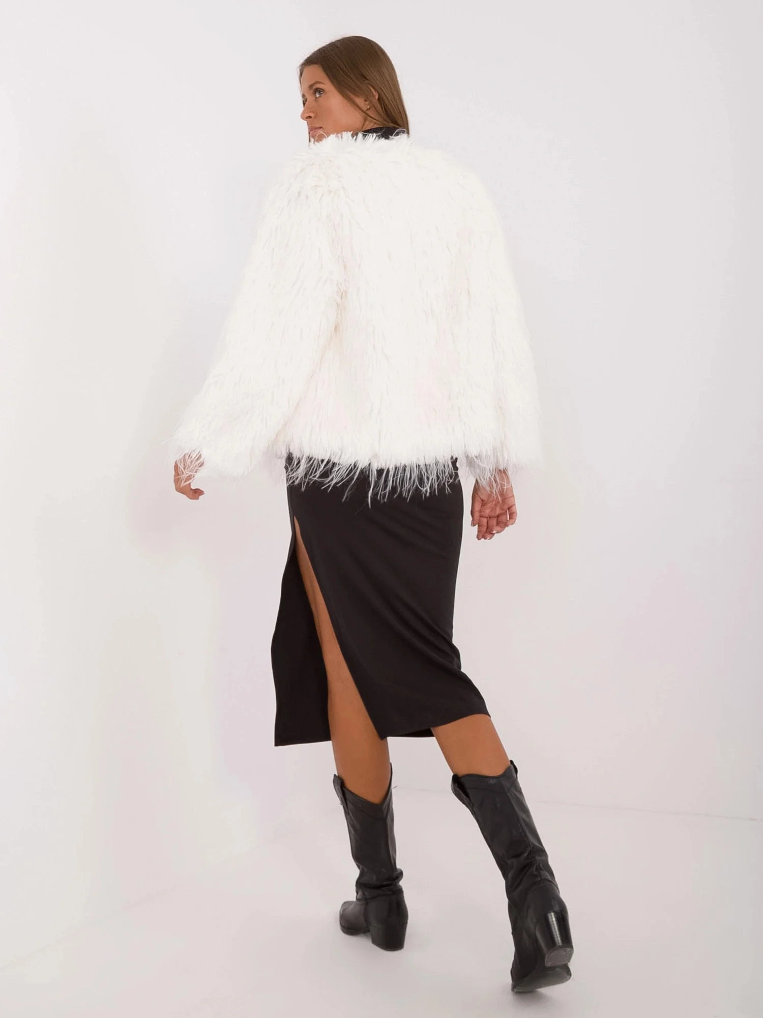 Bunda má podšívku, kulatý výstřih, dvě kapsy a zapíná se háčky. Kožešina má dlouhý vlas. Model má délku k bokům.