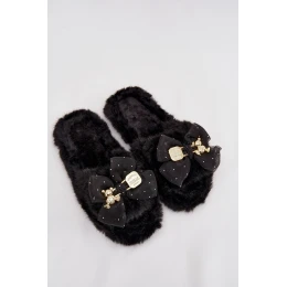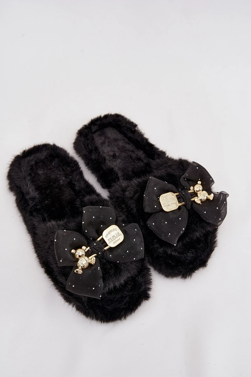 Kožešinové dámské pantofle s mašlí a zlatým zdobením Černé model 21711078 - Boto