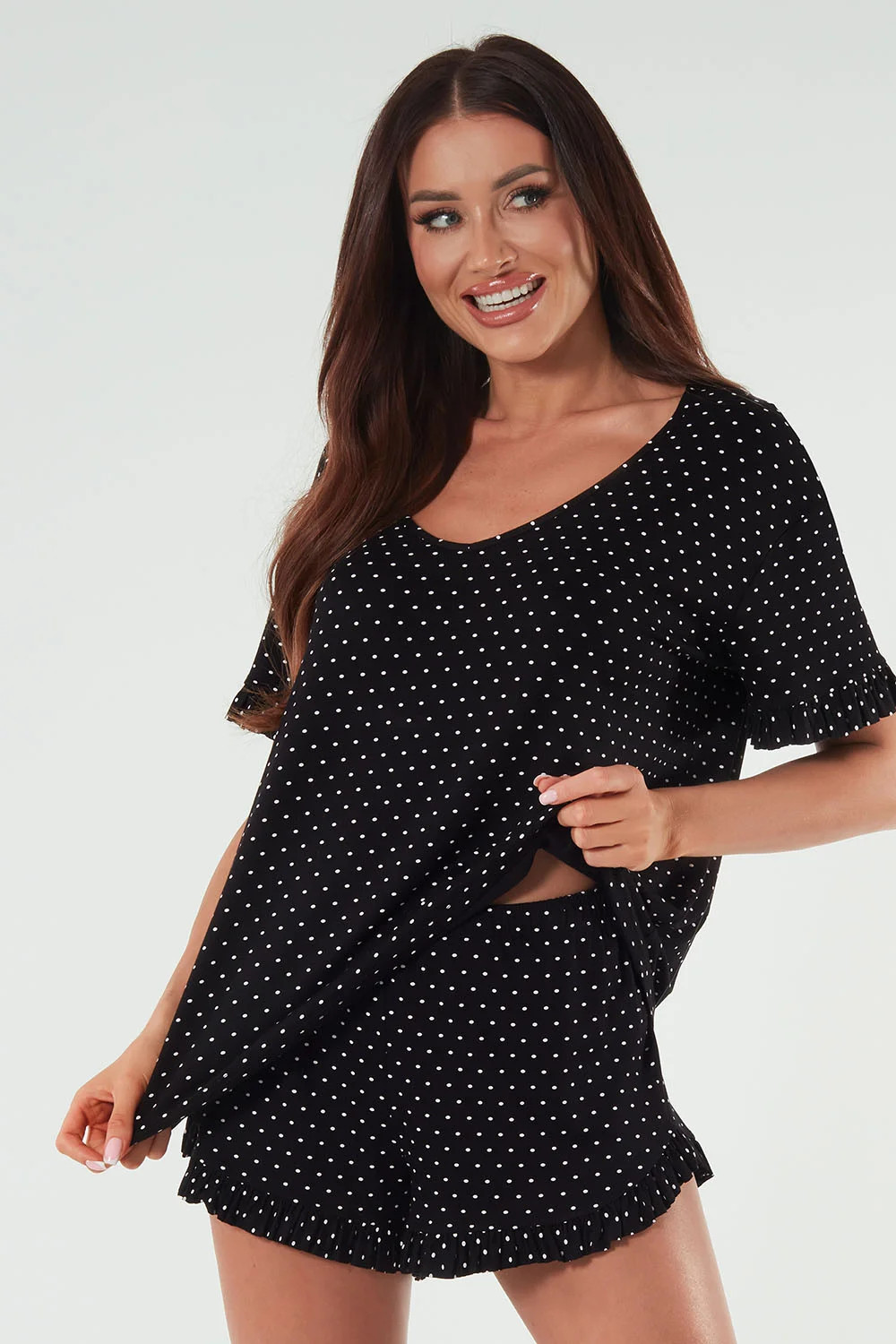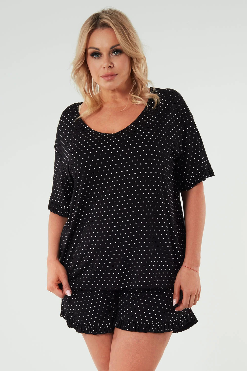 Modelka ma na sobie rozmiar S. Wymiary modelki: wzrost 173 cm, biust 90 cm, talia 64 cm, biodra 91 cm.