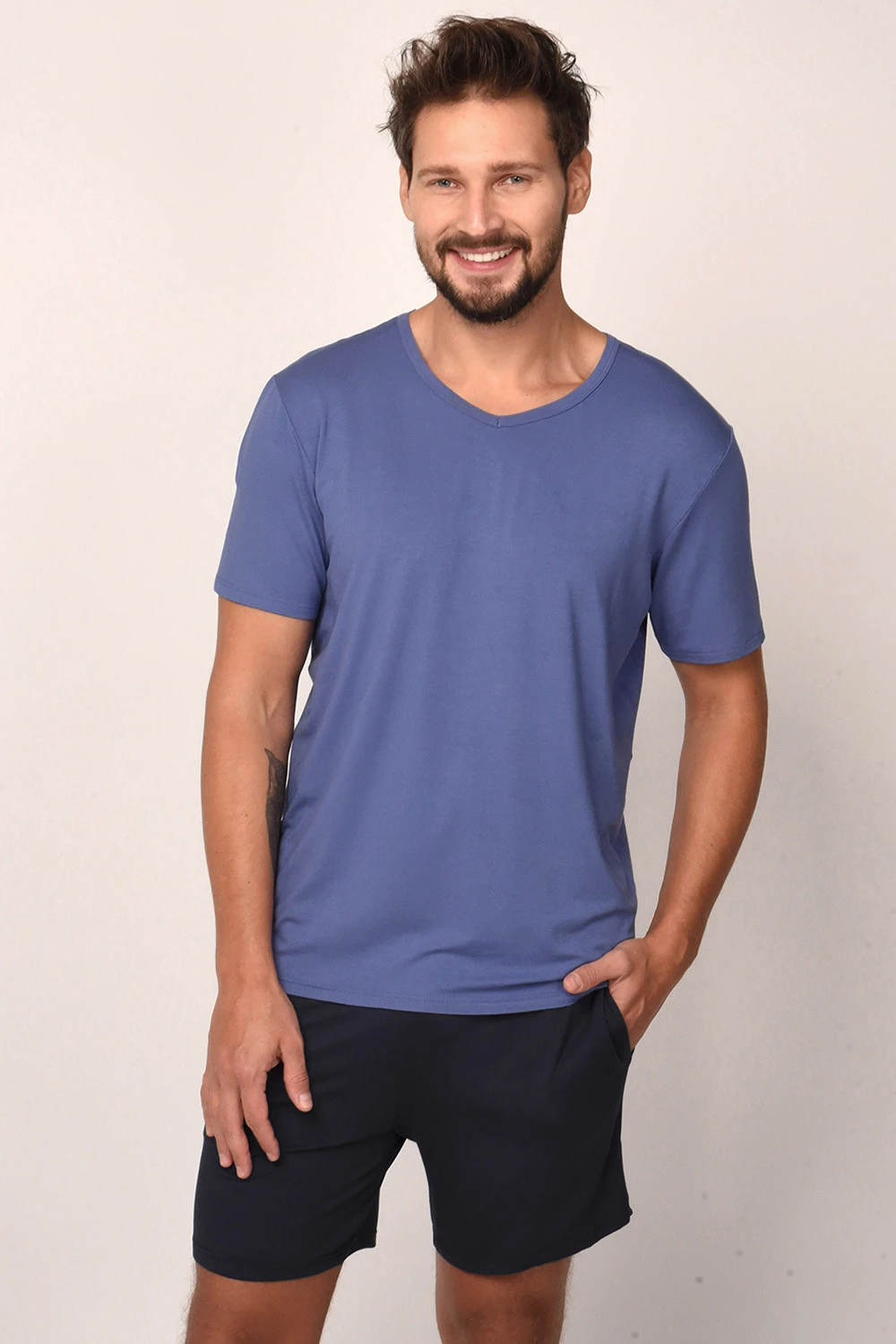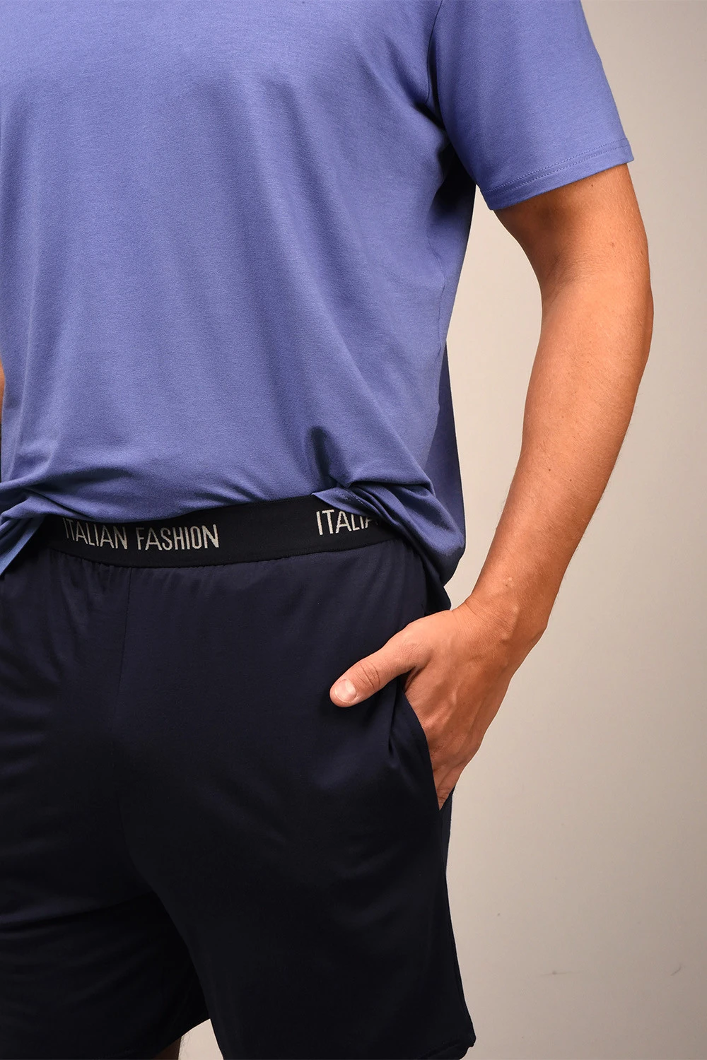 Nocna marki Italian Fashion. Model Dallas kr.r. kr.sp.. Produkt został wykonany z 90% wiskoza, 10% elastan. Rodzaj dekoltu: w serek. Posiada kieszenie. Produkt męski. Długość: krótkie. Długość rękawa: krótki.