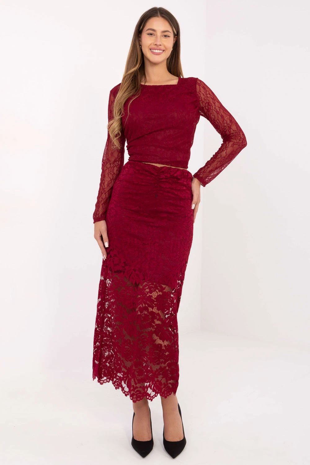 Elegantní a ženská krajková sukně, ideální jak do práce, tak na speciální příležitosti. Vyrobená z vysoce kvalitní směsi polyesteru, elastanu a viskózy, je elastická, lehká a pohodlná na nošení. Model midi délky má vsazený gumový pas, který zajistí pohodlné přizpůsobení postavě, a ozdobné rouchání na přední straně, které sukně dodává výjimečný charakter. Celá sukně je vyrobena z krajkové látky a podšívka v horní části zaručuje pohodlí a elegantní dokončení. Bez zapínání je sukně snadno nasazovatelná a ideálně se přizpůsobuje postavě. Jedná se o nadčasový model pro ženy, které si váží spojení elegance a pohodlí ve svých každodenních i speciálních stylizacích.