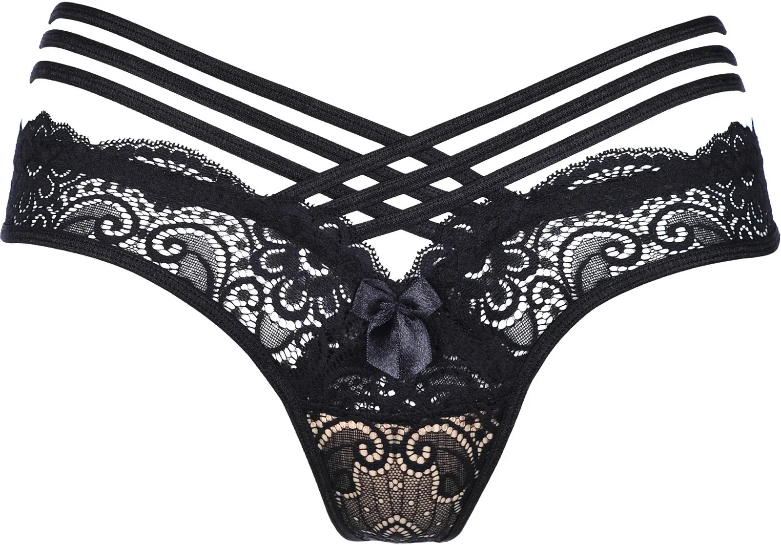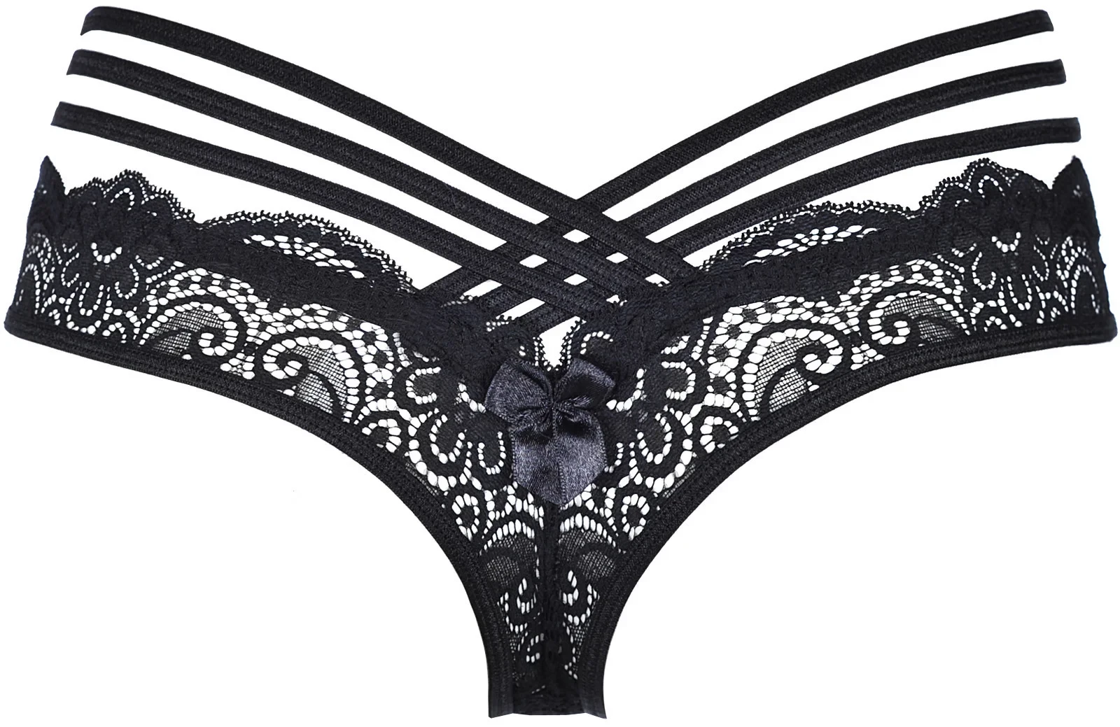 Černá krajková šňůrka V-9018 tvořená třemi tanga křížícími se na obou stranách, zdobená středovou mašličkou, je naprosto nezbytným doplňkem k topu V-9021. Celý komplet ocení i ty nejnáročnější zákaznice. Materiálové složení: Polyamid 82 %, Elastan 12 %, Bavlna 6 %