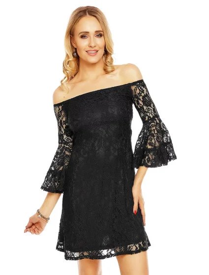 Krajkové dámské šaty s lodičkovým výstřihem a širokými rukávy černé - Černá - MAYAADI