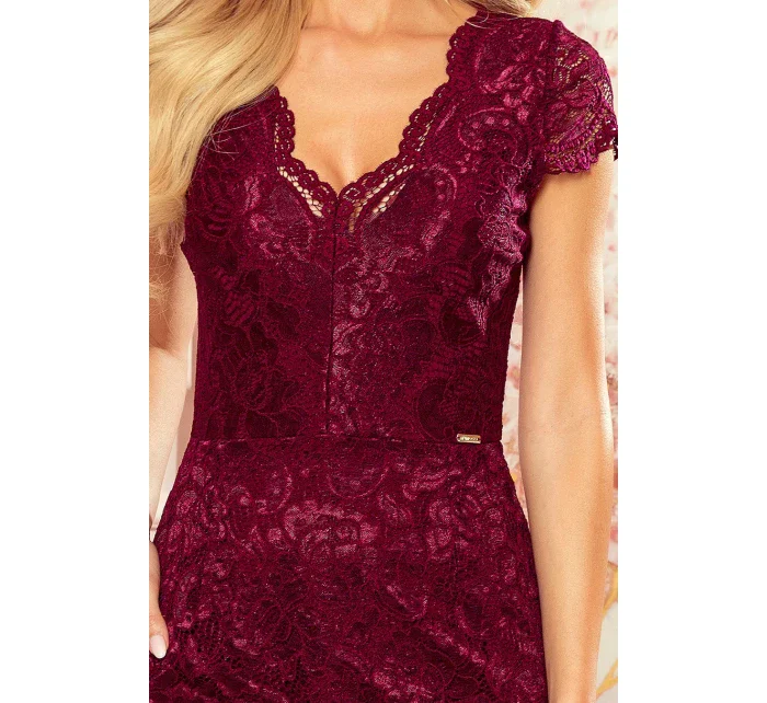 Krajkové dámské šaty ve švestkové barvě a krákými rukávy a dekoltem 316-7