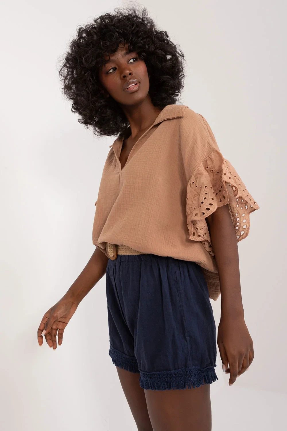 Tyto látkové šortky jsou ideální volbou pro každodenní letní stylizaci a dodají každému outfitu ležérní šarm. Jsou vyrobeny z lehkého lnu s příměsí bavlny a nabízejí prodyšnost a pohodlí i v těch nejteplejších dnech. Jejich široké nohavice s třásněmi dodávají charakter a lehkost a celému outfitu originální vzhled. Stylizované v ležérním duchu se tyto šortky hodí k mnoha různým outfitům. Díky jednobarevnému materiálu jsou univerzální a lze je snadno kombinovat s dalšími kousky ve vašem šatníku. Jejich vysoký střih navíc zdůrazňuje pas a dodává jim ženský nádech. Šortky mají v pase přezku, která vám umožní přizpůsobit si je své siluetě. Tyto šortky, které se skvěle hodí na každodenní procházky, setkání s přáteli nebo letní výlety, budou dokonalým doplňkem vašeho letního šatníku a poskytnou vám styl a pohodlí po celý den.
