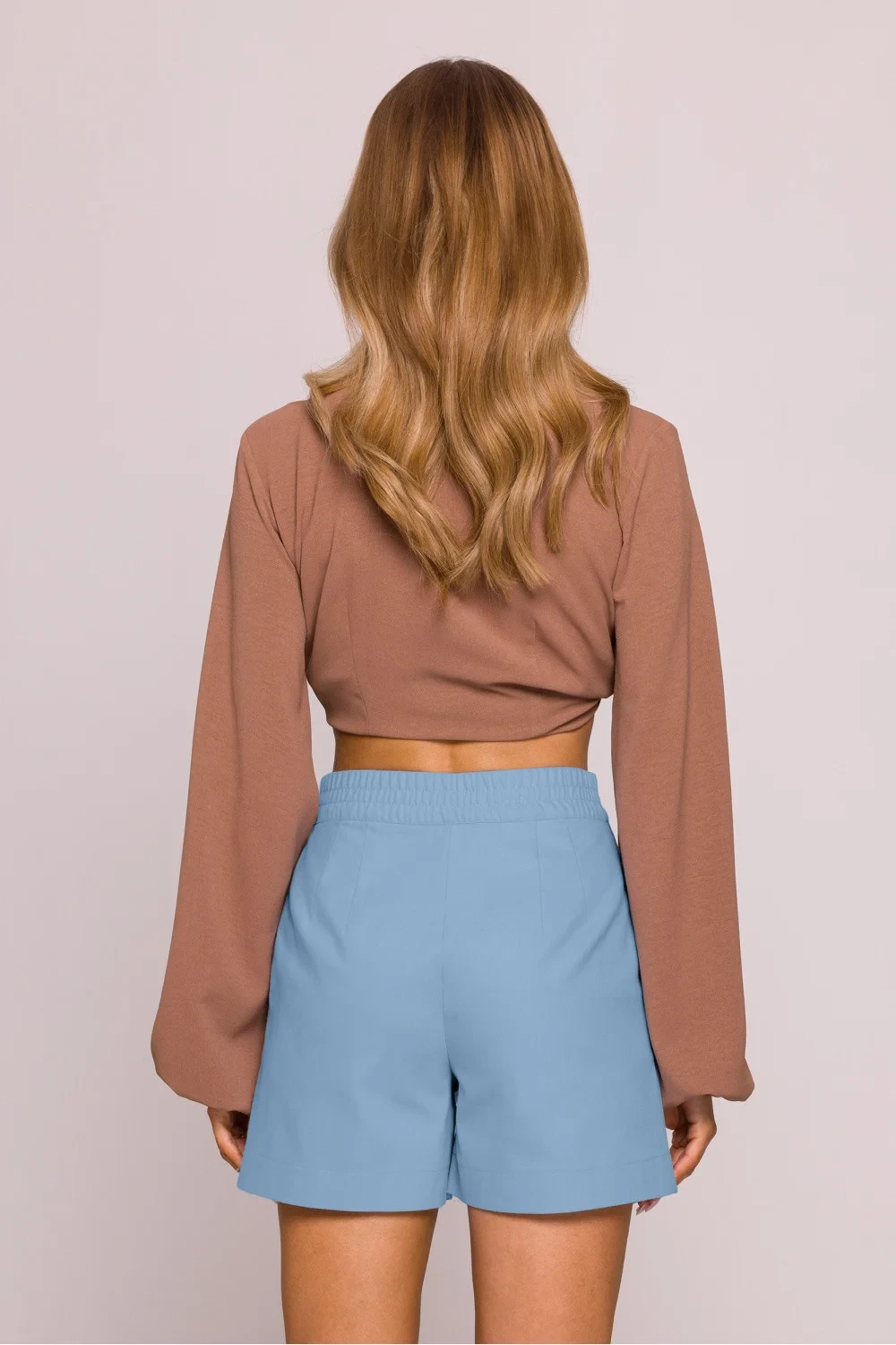 Krátký střih, přírodní materiál a promyšlené detaily, tyto kraťasy jsou ideální kombinací pohodlí a ležérní elegance. Vyrobena z bavlněné látky s matným povrchem, zaručuje pohodlí i v nejteplejších dnech. Model s vysokým pasem a elastickým zadním pásem, vpředu doplněný ozdobnými záložkami, které jemně zdůrazňují pas. Kraťasy se zapínají na skrytý zip a dva diskrétní knoflíky, co zaručuje pohodlné a estetické přizpůsobení. Po stranách jsou praktické kapsy, a mírně rozšířené nohavice dodávají postavě lehkost. Navrženo a vyrobeno v Polsku s ohledem na funkcionalitu a styl.