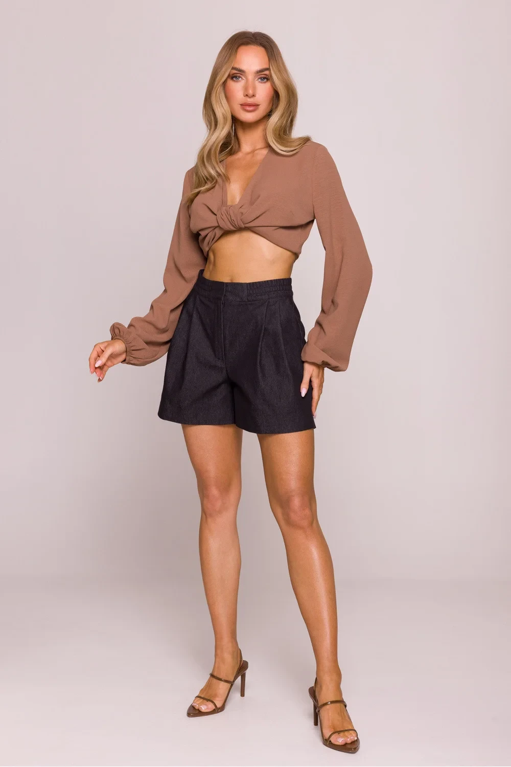 Krátký střih, přírodní tkanina a promyšlené detaily, tyto šortky jsou ideální kombinací pohodlí a ležérní elegance. Vyrobena z bavlněné látky s matným povrchem, poskytuje pohodlí i v nejteplejších dnech. Model s vysokým pasem a elastickým zadním pásem, vpředu doplněný ozdobnými záložkami, které decentně zdůrazňují pas. Šortky se zapínají na skrytý zip a dva diskrétní knoflíky, což zaručuje pohodlné a estetické přizpůsobení. Po stranách jsou praktické vsazené kapsy a mírně rozšířené nohavice dodávají siluetě lehkost. Navrženo a vyrobeno v Polsku s důrazem na funkčnost a styl.