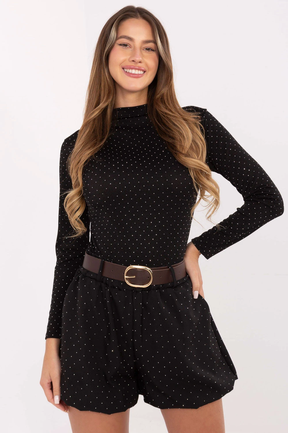 Elegantní dámské materiálové šortky ve stylu, vyrobené z vysoce kvalitní viskózy s přídavkem elastanu, který zajišťuje lehkost, prodyšnost a pohodlí nošení. Model má vysoký pas a široké nohavice, díky čemuž krásně zdůrazňuje pas a opticky zeštíhluje postavu. V pasu je vsazena elastická guma zaručující ideální přizpůsobení, a dodatečný zapínací pás umožňuje zdůraznění ženské figury. Šortky mají boční, zasouvací kapsy a podšívku, což zvyšuje pohodlí nošení. Celou plochu zdobí třpytivé flitry, které dodávají celku výjimečný charakter a elegantní lesk. Jedná se o skvělý návrh na společenské události a večírky, ideální kombinaci elegance, stylu a pohodlí.