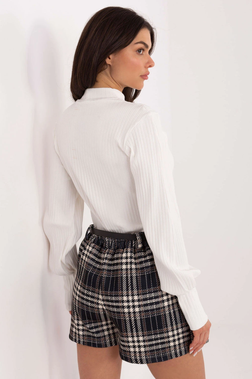 Sukně-šortky v kostkovaném vzoru jsou elegantní a stylovým návrhem pro ženy, které rády kombinují pohodlí šortek s ženským vzhledem sukně. Přední část modelu zdobí plisovaný vložka sukně, která dodává celku eleganci a jemně zakrývá kratší střih šortek. Na zadní straně je v pasu vsazena elastická guma, díky čemuž se sukne-šortky perfektně přizpůsobí postavě a zajistí pohodlí během celého dne. Dominantní kostkovaný vzor podtrhuje jejich elegantní charakter, a vysoký pas opticky prodlužuje nohy a krásně zvýrazňuje pas. Široké nohavice dodávají lehkost a pohyblivost, zároveň zachovávají stylový a decentní vzhled. Model je vyroben z polyesteru a viskózy, což zajišťuje prodyšnost, odolnost a příjemný dotek. Sukně-šortky nemají kapsy ani tradiční zapínání, což jim dodává minimalistickou linii, ale jsou vybaveny zapínacím páskem, který je praktickým a dekorativním prvkem celku. Jsou ideální volbou pro každodenní stylizace a do práce, kdy chcete vypadat elegantně a zároveň se cítit pohodlně a volně.
