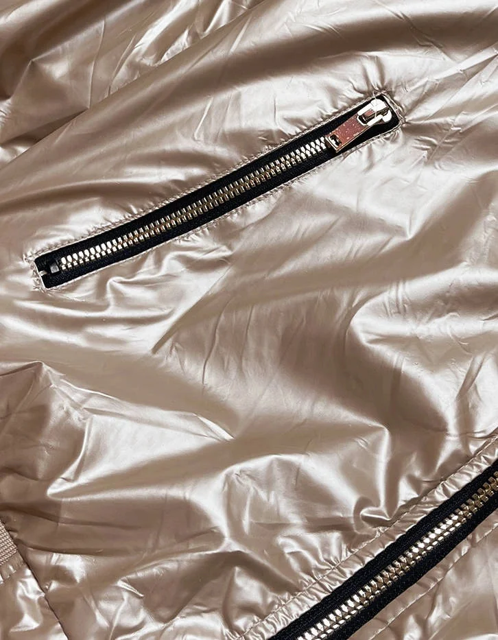 Bunda je lehce lesklá, má volný střih, dvě kapsy a zapíná se zipem. Model má délku k bokům a je olemovaný stahovacími lemy.