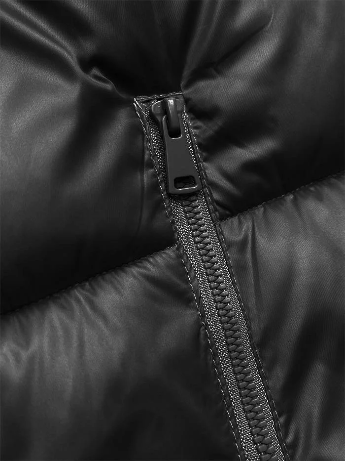 Vesta je zateplená syntetickou péřovou výplní, má dvě kapsy a zapíná se zipem. Model má kapuci, kterou je možné odepnout. Vesta má délku do pasu.
