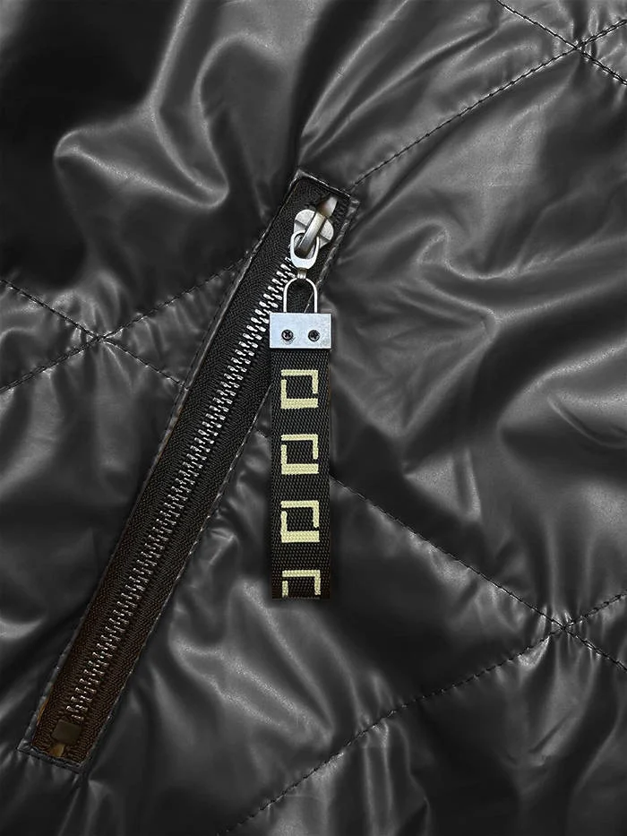 Bunda má volný střih, dvě kapsy a zapíná se zipem. Model má látkové stahovací lemy. Bunda má délku k bokům.