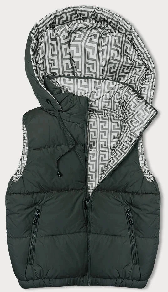 Krátká péřová dámská vesta v army barvě s kapucí (16M9091-136)