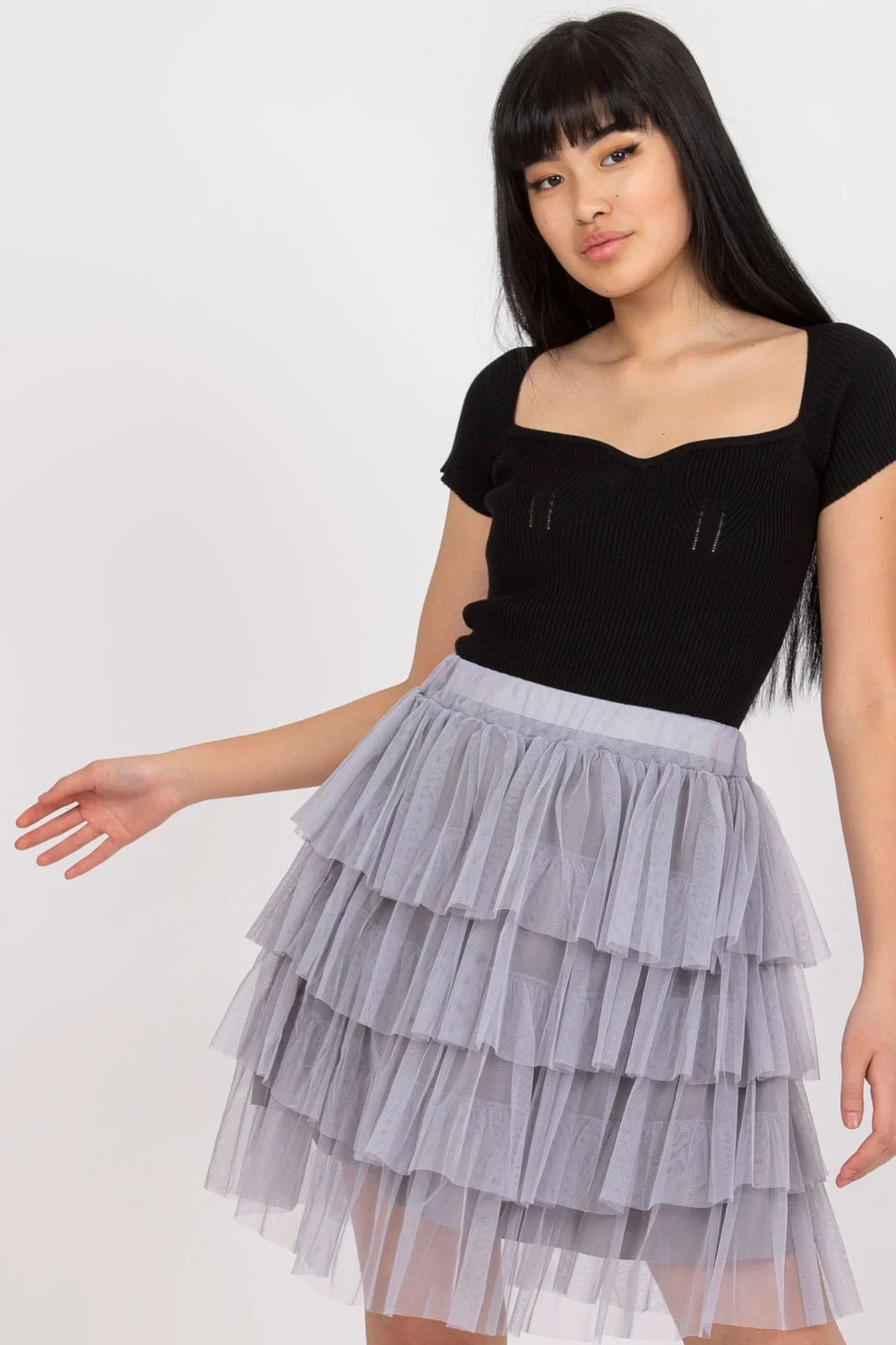 Tylová sukně s volány je elegantní nabídkou, která dodá každému outfitu lehkost a ženský šarm. Vyrobená z vysoce kvalitního materiálu z polyesteru a viskózy, poskytuje pohodlí nošení a krásně padne na postavě. Sukně má hladký vzor a mini délku, která zdůrazňuje nohy a dodává celku jemný, ale výrazný charakter. Vrstvy tylu s jemnými volány vytvářejí efektní zakončení, ideální na speciální příležitosti, jako jsou večírky, svatby nebo večerní vycházky. Model je vybaven podšívkou, která zaručuje pohodlí nošení a poskytuje plnou volnost pohybu. Bez zapínání, sukně je snadno nasazovatelná a nošení, a elastický pás (pokud je přítomen) dodatečně zvyšuje pohodlí. To je skvělá volba pro ženy, které si cení eleganci v módním podání.