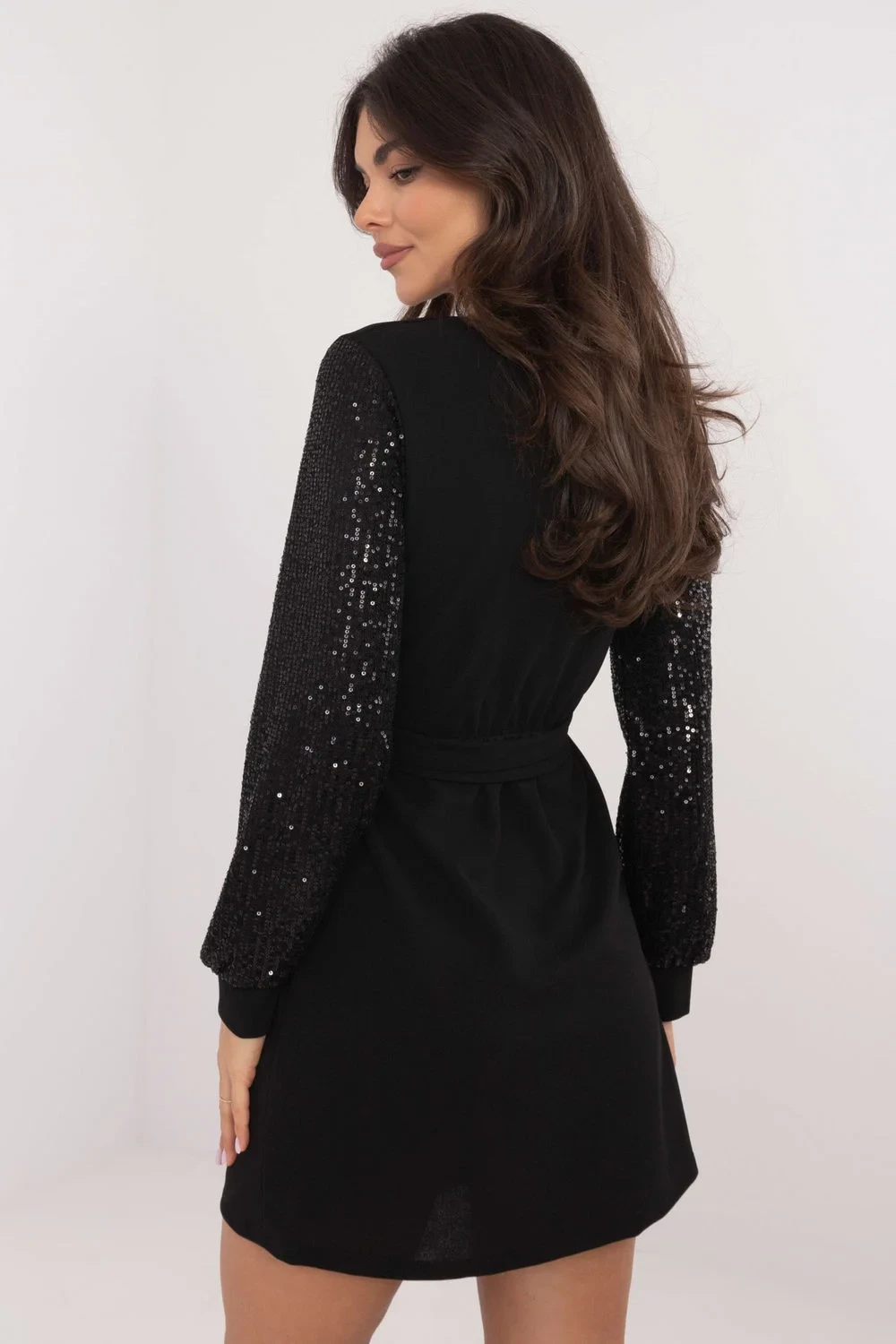 Elegantní koktejlové šaty ve střihu tužky, ideální pro večírky a formální události, ohromující svým rafinovaným stylem. Model mini délky s přesýpacím dekoltem jemně zdůrazňuje siluetu a šněrování v pasu dále tvaruje pas, dodávajíc celku ženský charakter. Šaty vyrobené z hladkého materiálu, do kterého patří polyester a elastan, zajistí pohodlí a přizpůsobení. Pozornost upoutávají dlouhé rukávy zdobené flitry, které jí dodávají výjimečný lesk a dělají z ní ideální volbu pro večerní vycházky.