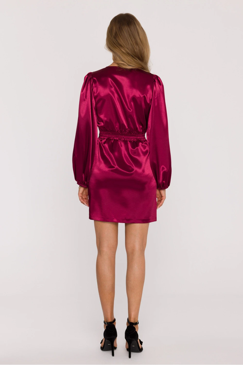 Oslnivý a ženský mini šaty ze saténu, navržený pro ženy, které oceňují eleganci spojenou s moderním stylem. Vyrobena z hladkého, plného saténu s jemným leskem, krásně odráží světlo a jemně zdůrazňuje postavu. Model je vyznačen hlubokým, šátkovým výstřihem, který zdůrazňuje linii krku a dekoltu v smyslný, ale stále elegantní způsob. Dlouhé, nadýchané rukávy ukončené gumou dodávají lehkost a romantický charakter. V pase je široký pás s dekorativními knoflíky vpředu a gumou vzadu, která zajišťuje ideální přizpůsobení a pohodlí nošení. Jednoduché, lehce přiléhavé dno zdůrazňuje ženskou siluetu, zachovávaje přitom elegantní rovnováhu. Šaty nemají zapínání ani podšívku, jsou navlékány přes hlavu, což zajišťuje, že jsou lehké a pohodlné na nošení. Model byl navržen a ušit v Polsku s důrazem na detaily. Jedná se o elegantní mini šaty ve šátkovém střihu, ideální na večírky, večerní vycházky a speciální příležitosti, kdekoliv se objevíte, okouzlíte saténovým zářem a ženskou formou.