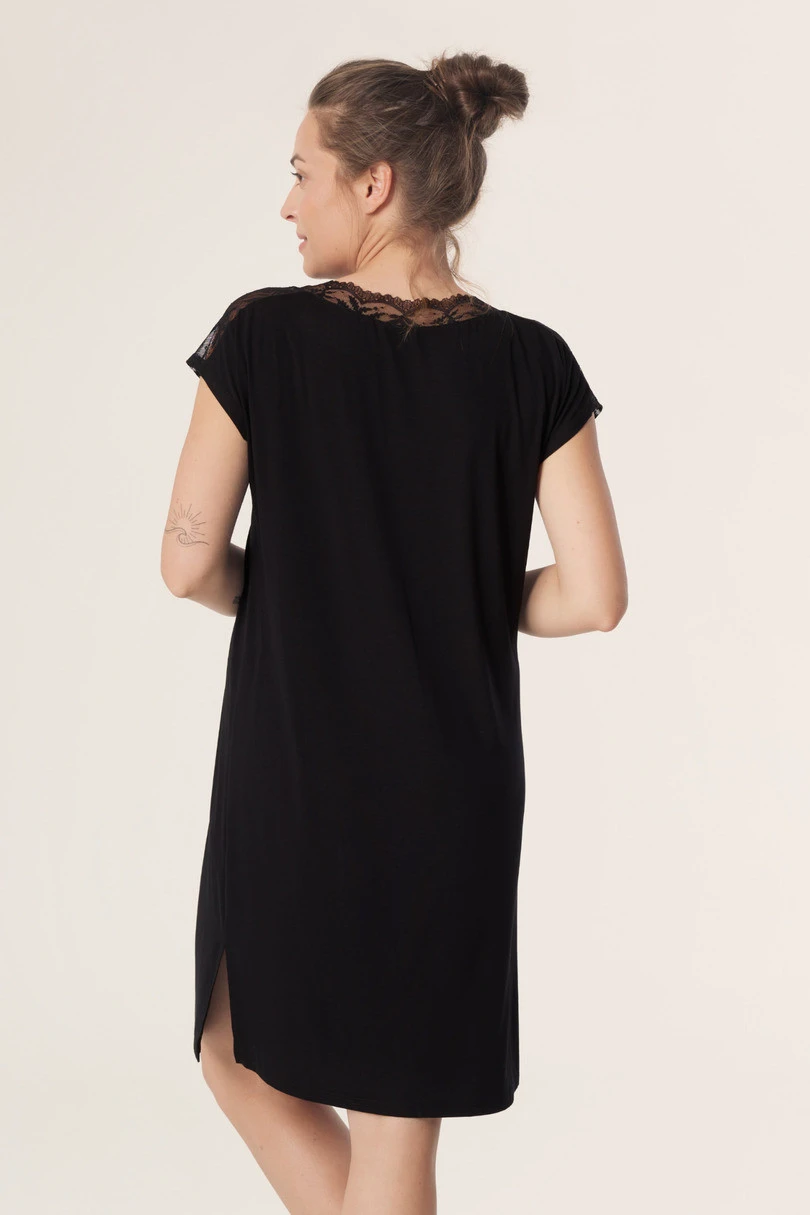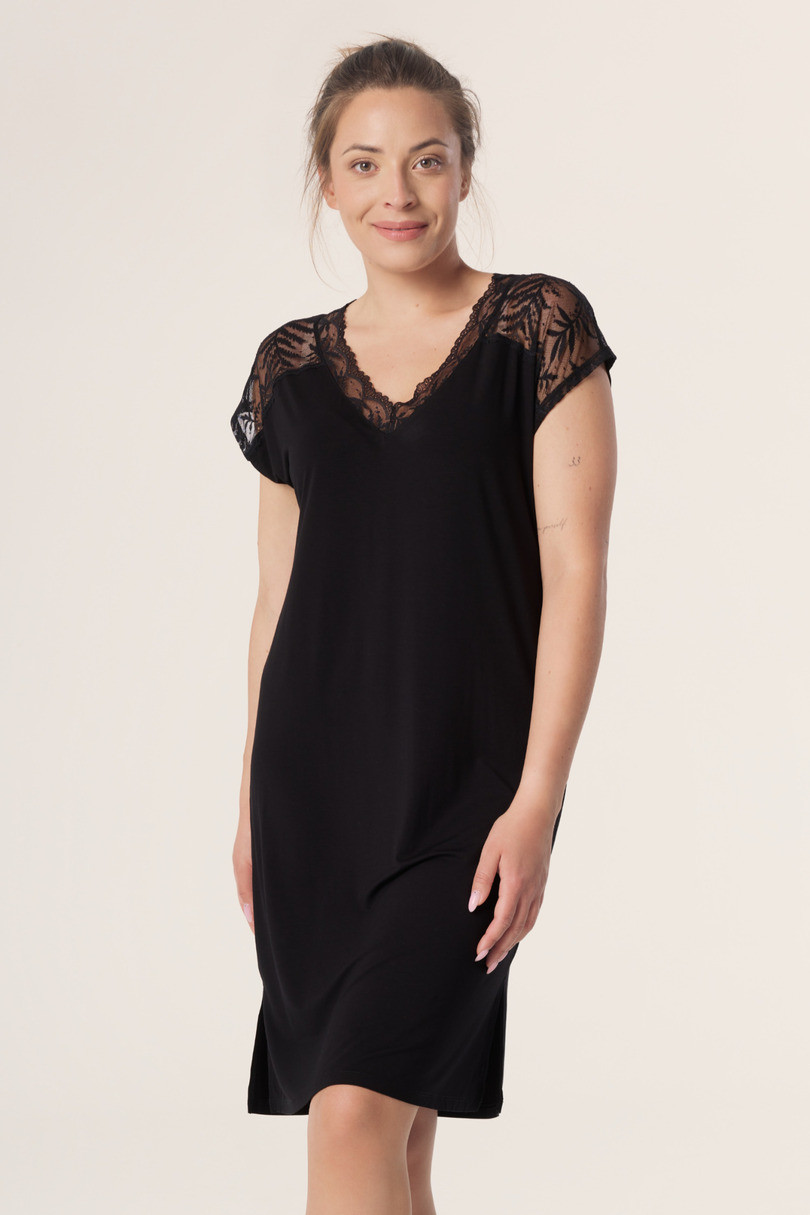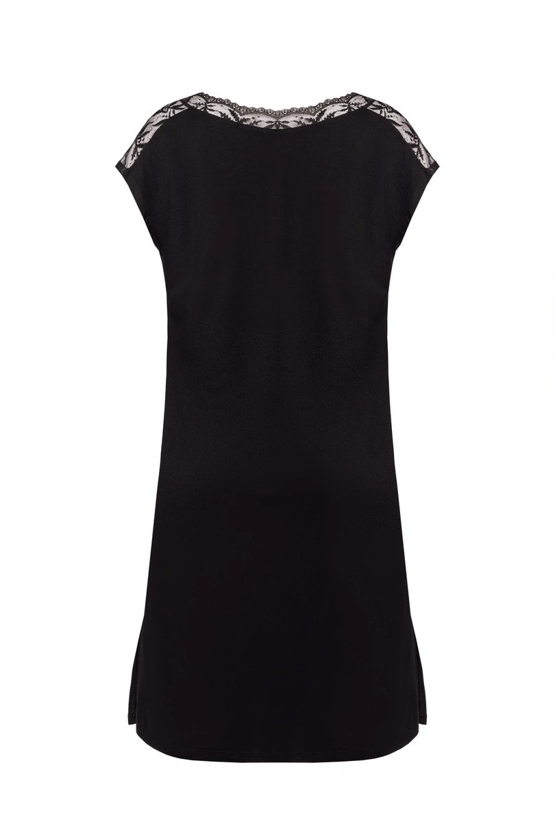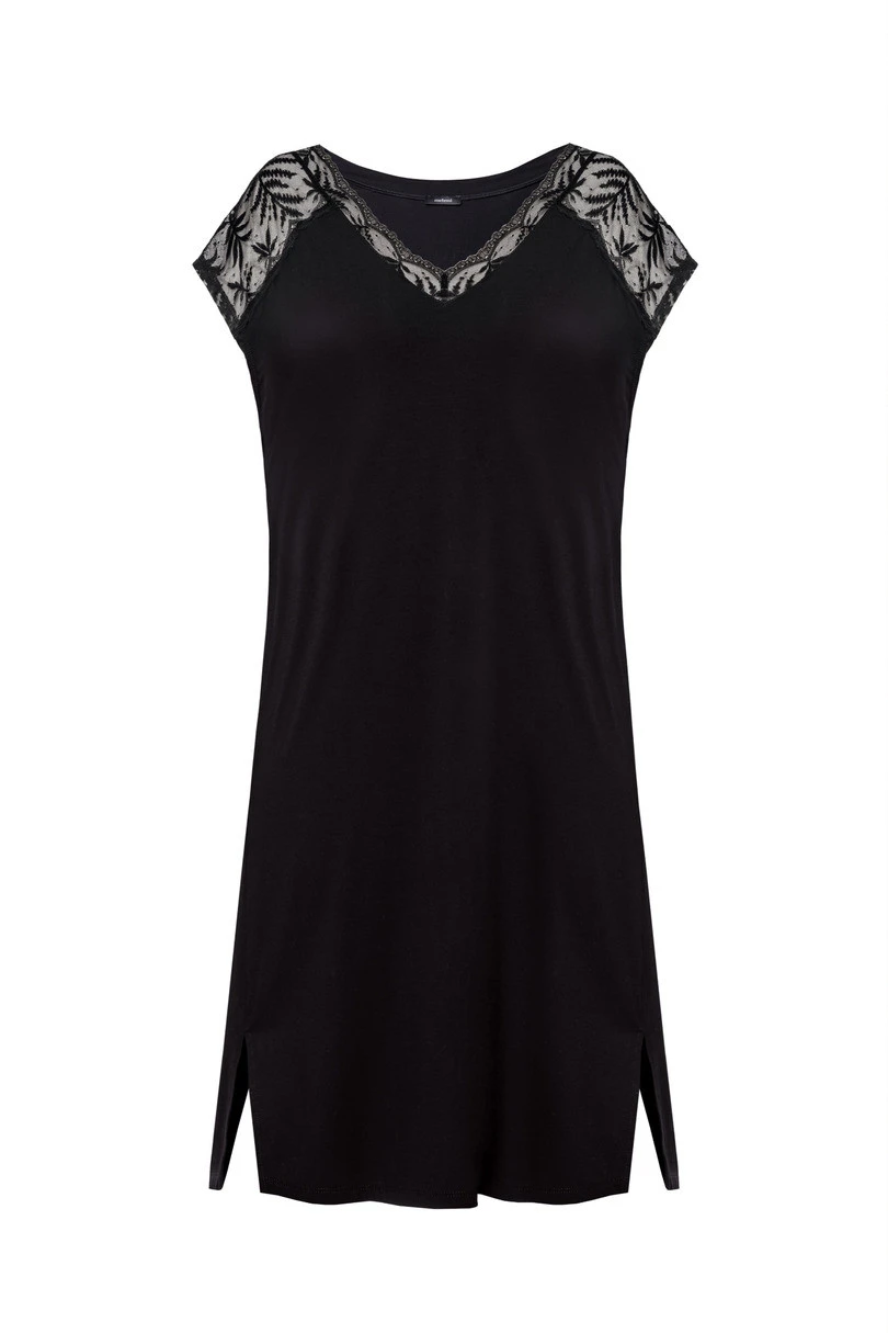 Elegancka koszulka nocna damska wykonana z delikatnej, wysokogatunkowej wiskozy to połączenie komfortu i zmysłowego stylu. Model o klasycznym kroju delikatnie otula sylwetkę, podkreślając kobiece kształty. Dekolt w kształcie litery „V” oraz krótkie rękawki zostały ozdobione subtelną, ażurową koronką, która dodaje całości wyjątkowego uroku i kobiecej lekkości. Rozcięcia po bokach zapewniają swobodę ruchów i elegancki wygląd. Idealna zarówno na spokojny sen, jak i romantyczny wieczór. Koszulka zapakowana jest w eleganckie pudełko – doskonały pomysł na prezent.