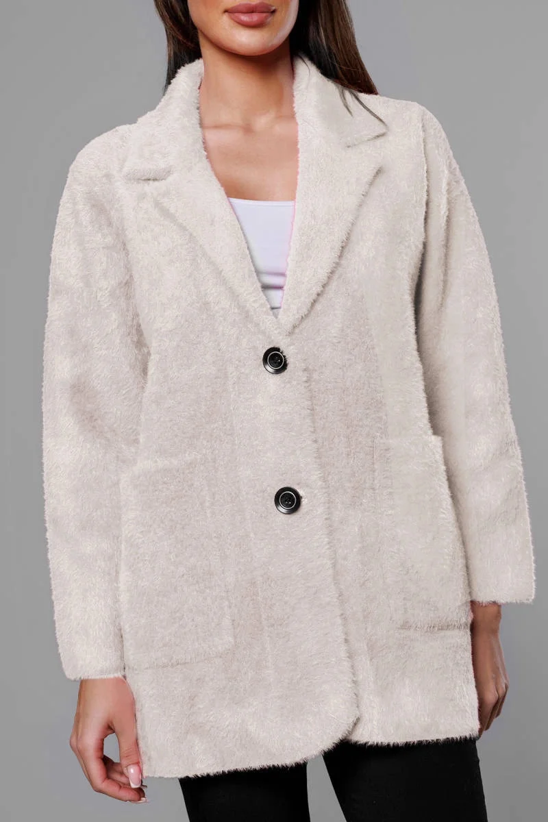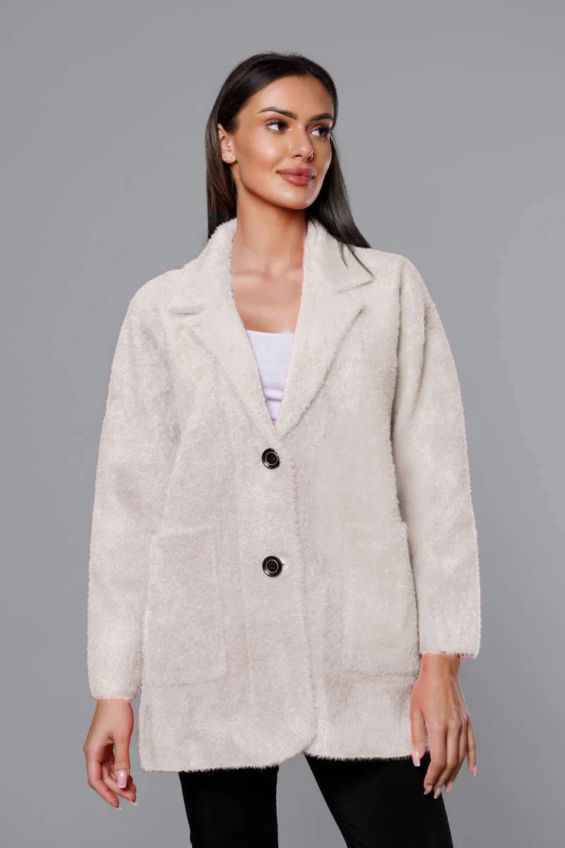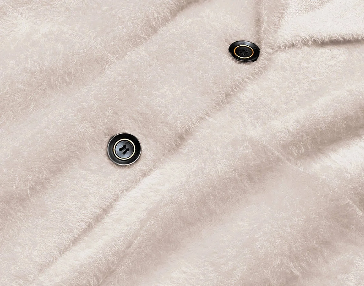 Přehoz je měkký a příjemný na dotyk, má dvě kapsy a zapíná se knoflíky. Model má délku do poloviny stehen.