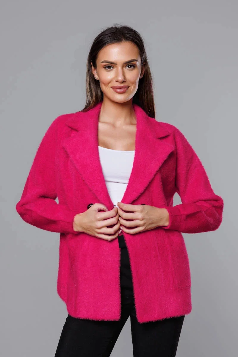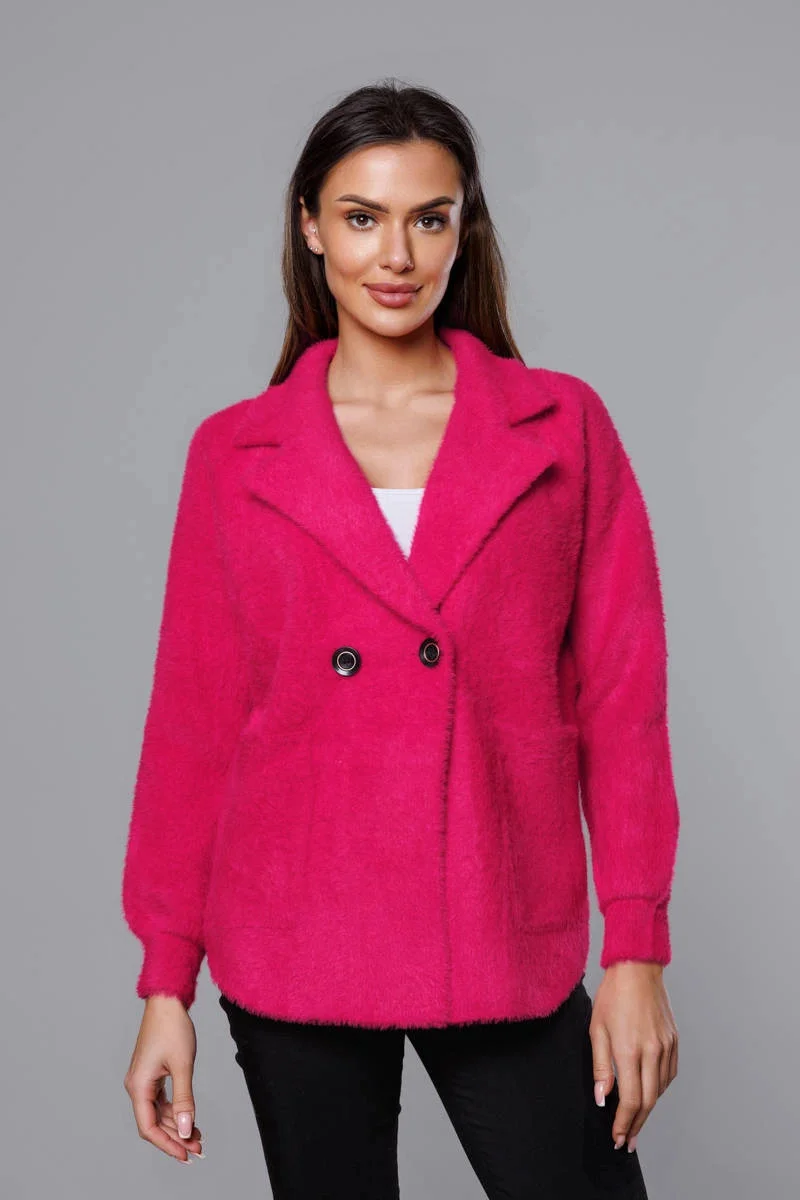 Přehoz je měkký a příjemný na dotyk, má dvě kapsy a zapíná se knoflíkem. Rukávy jsou olemované stahovacími lemy. Model má délku k bokům.
