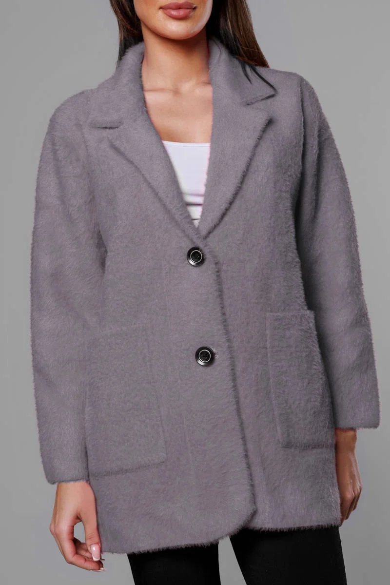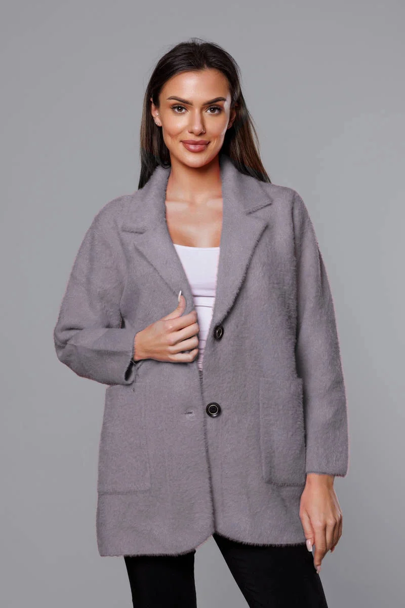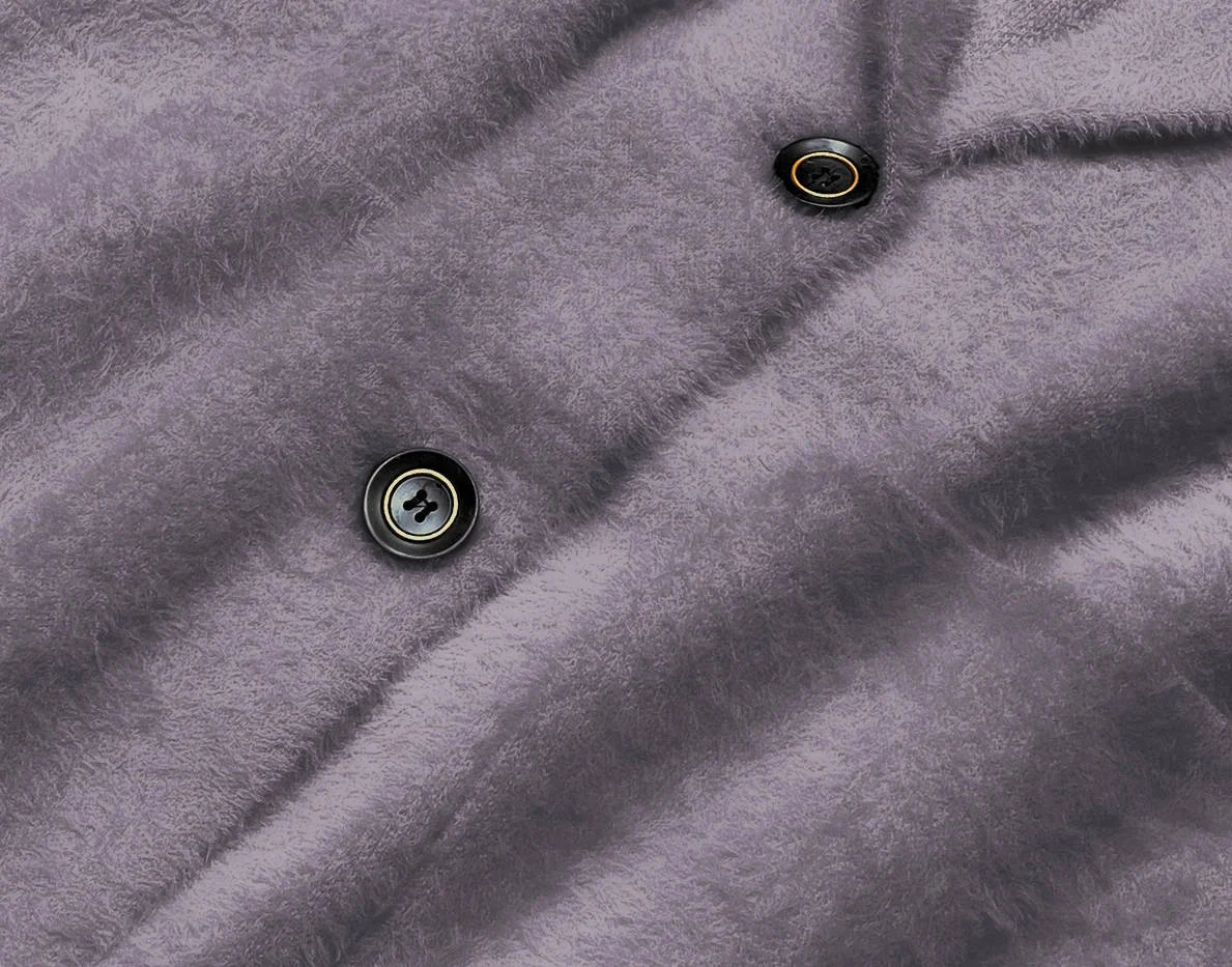 Přehoz je měkký a příjemný na dotyk, má dvě kapsy a zapíná se knoflíky. Model má délku do poloviny stehen.