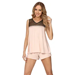 Stylové dvoudílné pyžamo s nápadným průsvitným tylem na ramenou. Tečkovaný tyl, černý, sexy. Pyžamo je vyrobeno z měkké, pružné tkaniny. Halenka s širšími ramínky, komplet s pohodlnými krátkými šortkami na gumu. Složení: 94 % viskóza, 6 % elastan.EAN čárové kódy zboží jsou: