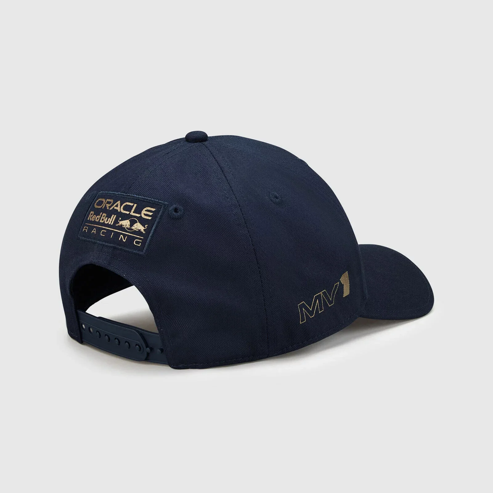 Tmavě modrá kšiltovka Red Bull doplněná zlatými prvky Max Verstappen a Red Bull Racing F1.