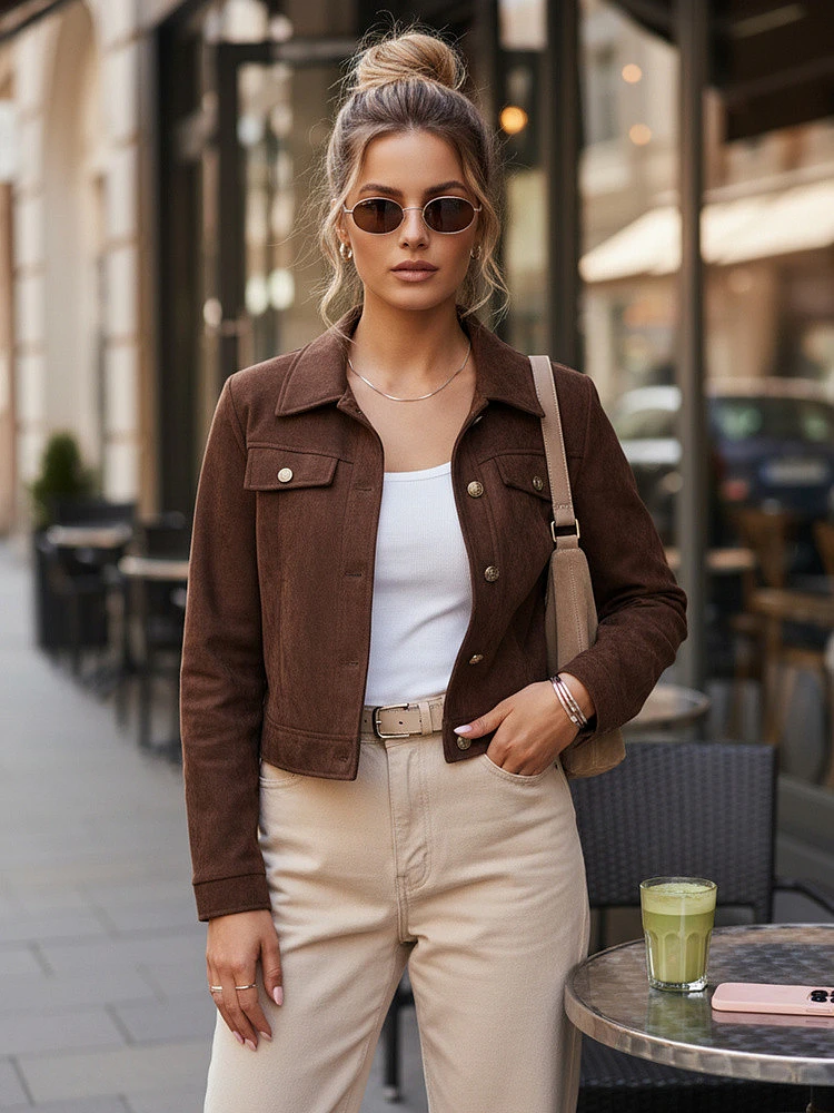 Kurtka o krótkim kroju łączy klasyczny styl z subtelną elegancją inspirowaną miejską modą. Miękka struktura materiału nadaje jej wyjątkowego charakteru i podkreśla estetyczne wykończenie. Starannie zaprojektowana zapewnia komfort noszenia oraz uniwersalność w codziennych stylizacjach. Model dobrze komponuje się zarówno z casualowymi, jak i bardziej kobiecymi zestawami.