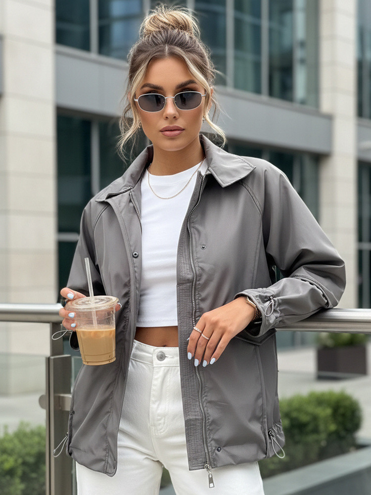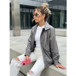 Stylowa kurtka o kroju oversize o dłuższym fasonie. Model posiada ściągacze na dole. Kurtka zapinana jest na zamek. Jest niezwykle lekka, dzięki czemu będzie idealna na ciepłe dni. Rękawy zakończone są ozdobnymi ściągaczami.