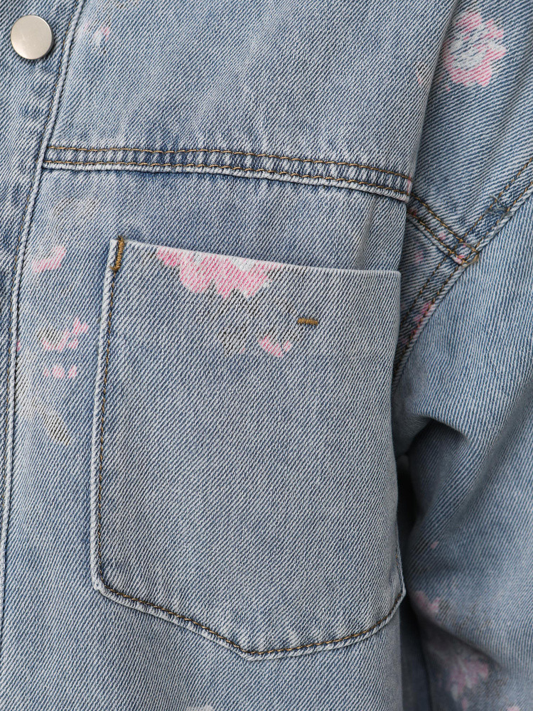 Kurtka jeansowa o luźnym fasonie wyróżnia się subtelnym, kwiatowym nadrukiem, który nadaje stylizacjom lekkości. Klasyczny kołnierz oraz zapięcie na guziki podkreślają ponadczasowy charakter fasonu. Miękki materiał z przewagą bawełny zapewnia komfort w codziennym użytkowaniu. Dwie kieszenie zewnętrzne zwiększają funkcjonalność i równoważą proporcje przodu.