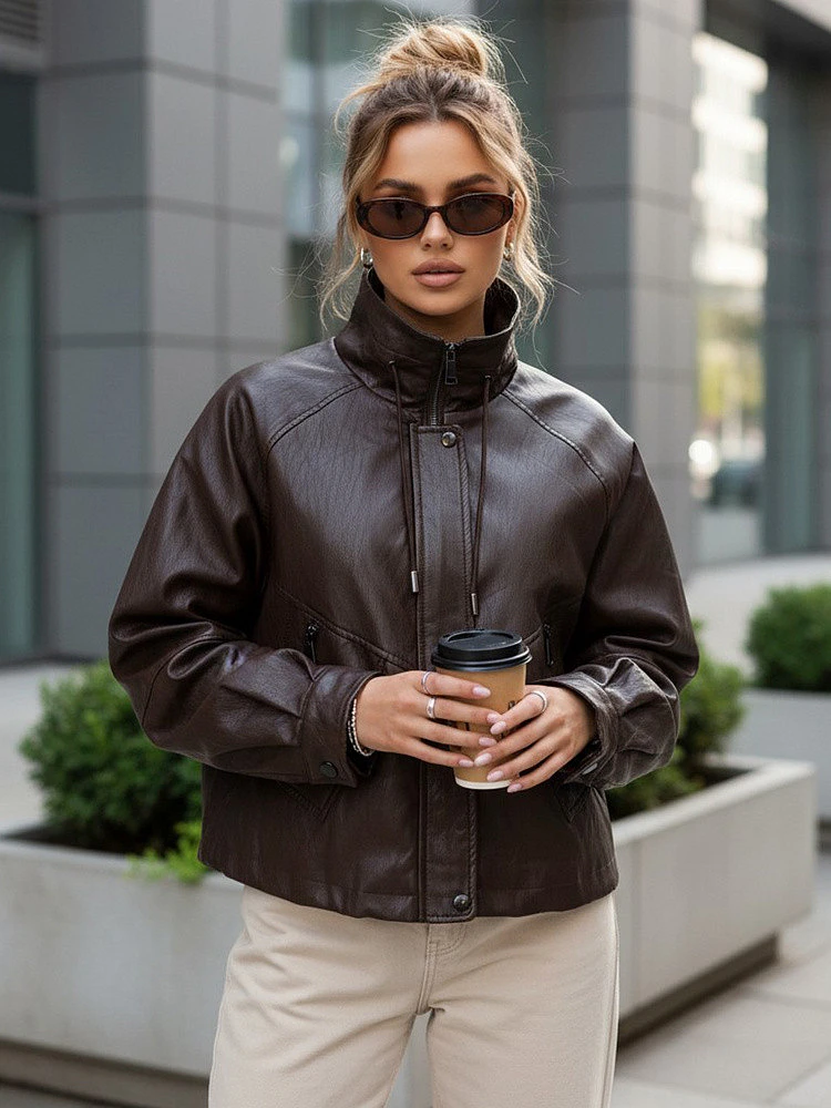 Kurtka wykonana ze skóry ekologicznej sprawdzi się w sezonie przejściowym, chroniąc przed wiatrem i chłodniejszym powietrzem. Krótki fason w połączeniu z elastycznym wykończeniem u dołu pozwala na wygodne dopasowanie do sylwetki.