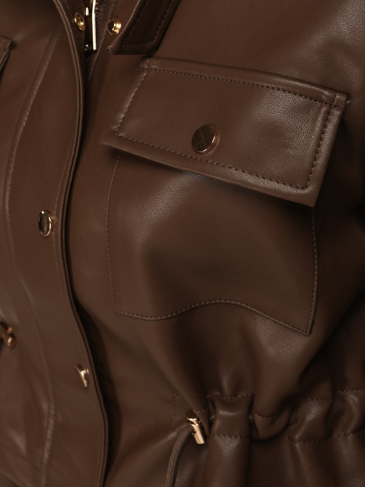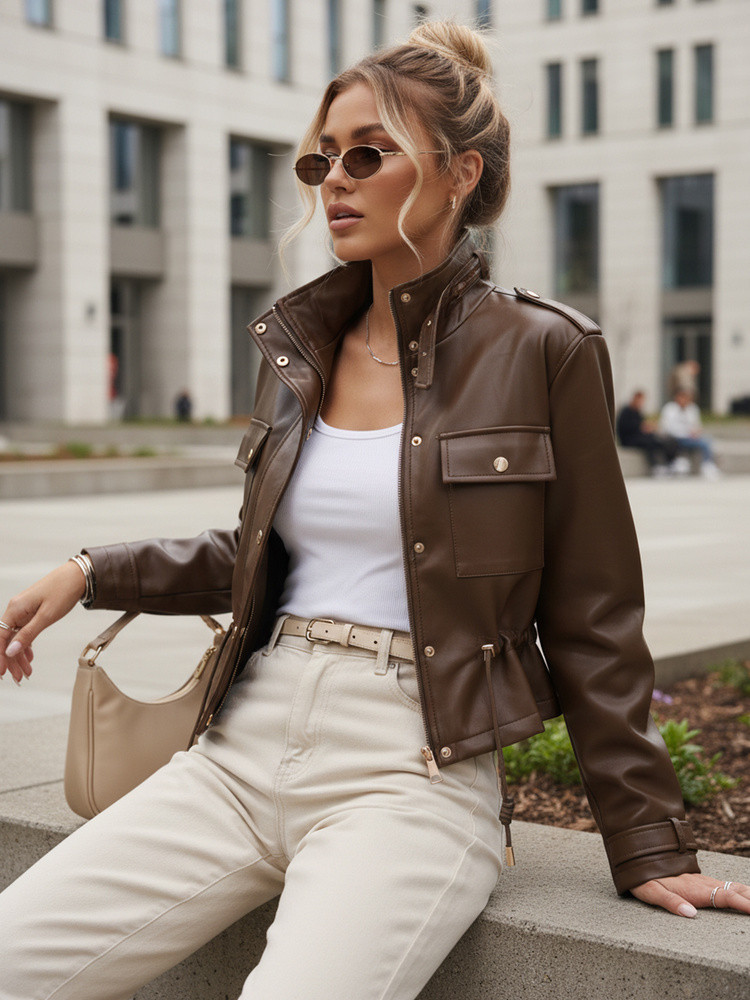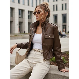 Kurtka wykonana ze skóry ekologicznej sprawdza się w sezonach przejściowych, chroniąc przed wiatrem i lekkim chłodem. Regulacja w talii pozwala na indywidualne dopasowanie, dzięki czemu dobrze układa się na sylwetce.