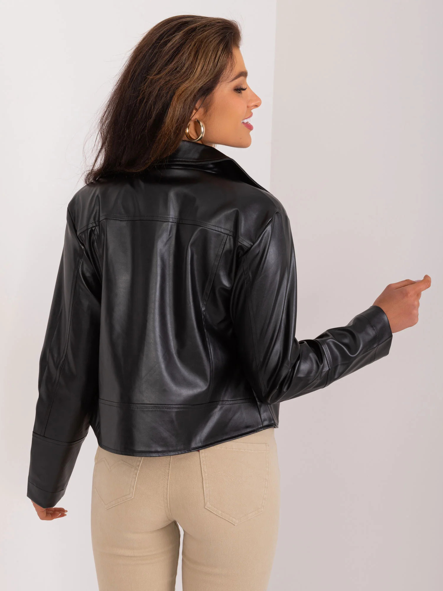 Wymiary kurtki w rozmiarze 36 mierzone na płasko: szerokość pod pachami - 58 cm, długość całkowita - 46 cm, długość rękawa - 60 cm.