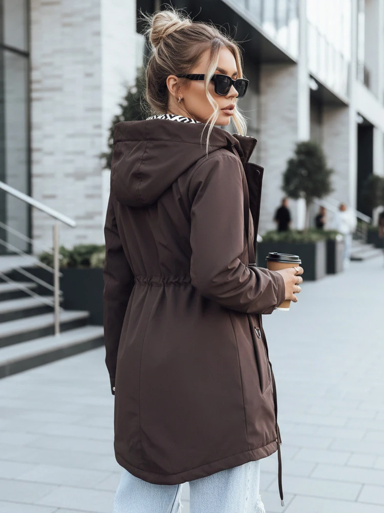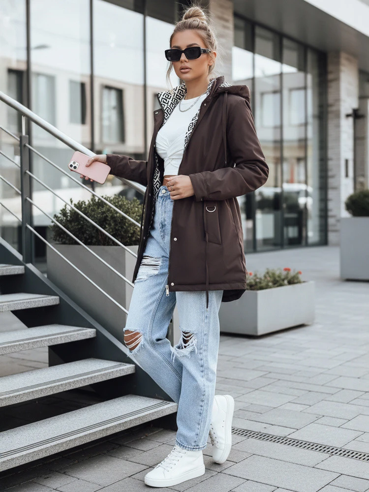 Stylowa parka damska w modnym brązowym kolorze. Kurtka została zaprojektowana z myślą o komforcie i nowoczesnym stylu – idealna na sezon przejściowy oraz chłodniejsze dni. Posiada odpinany kaptur, praktyczne kieszenie oraz ściągacz w talii, który pozwala dopasować fason do sylwetki. Wnętrze kurtki zdobi modna, kontrastowa podszewka z geometrycznym wzorem.