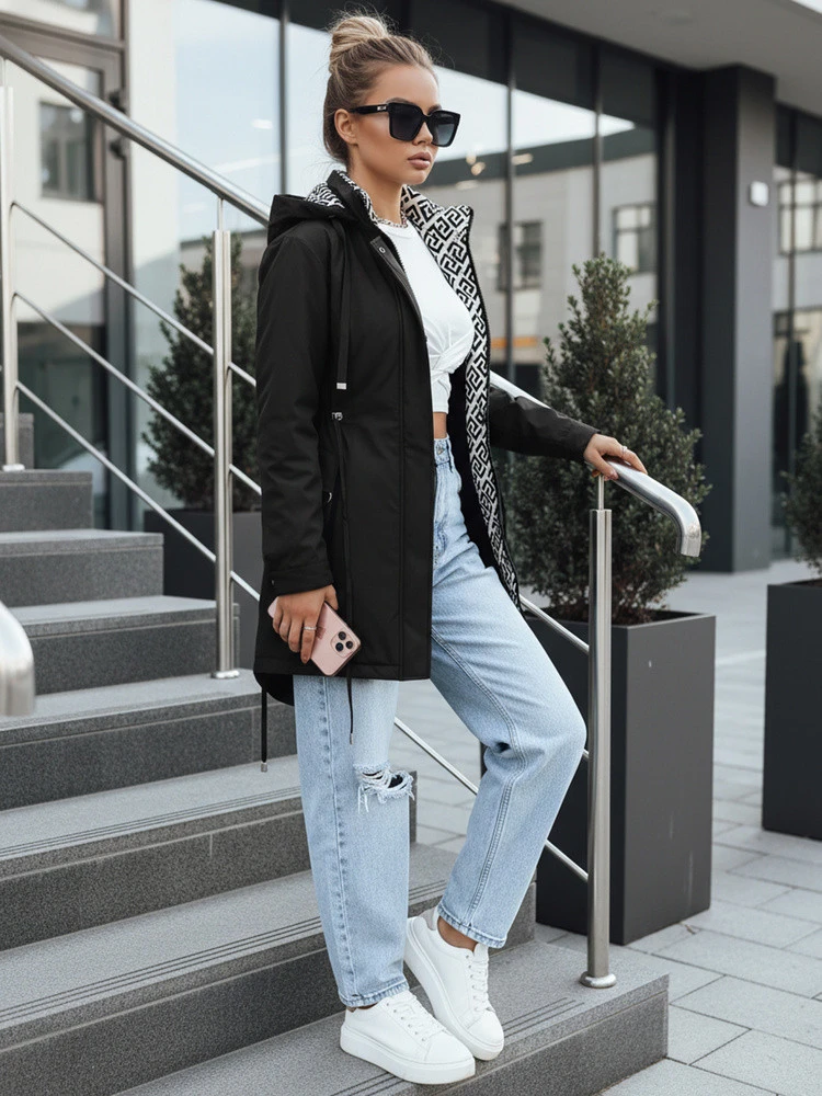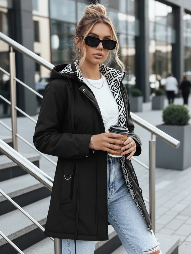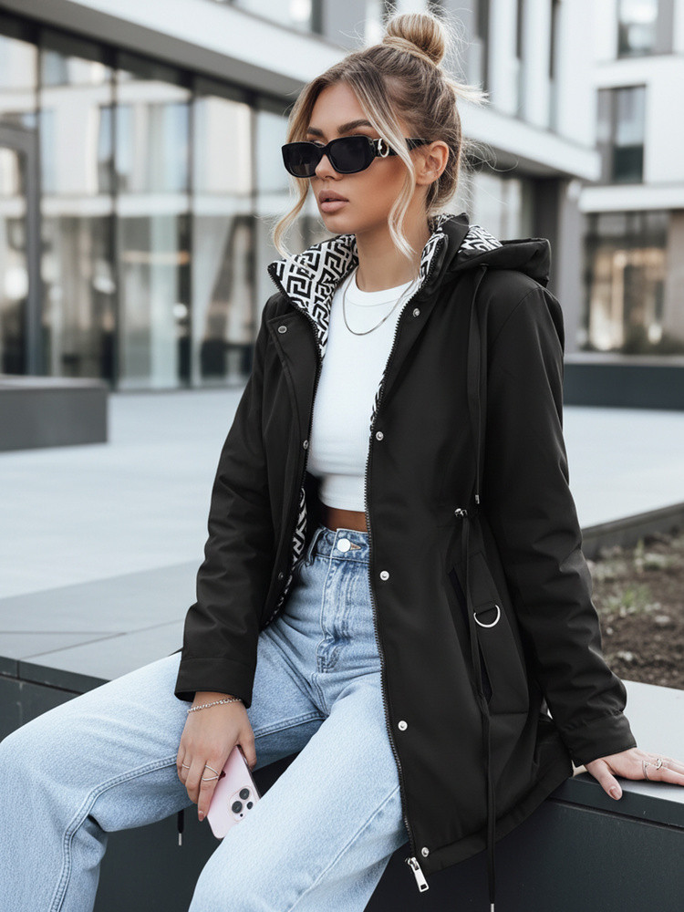 Stylowa parka damska w modnym czarnym kolorze. Kurtka została zaprojektowana z myślą o komforcie i nowoczesnym stylu – idealna na sezon przejściowy oraz chłodniejsze dni. Posiada odpinany kaptur, praktyczne kieszenie oraz ściągacz w talii, który pozwala dopasować fason do sylwetki. Wnętrze kurtki zdobi modna, kontrastowa podszewka z geometrycznym wzorem.
