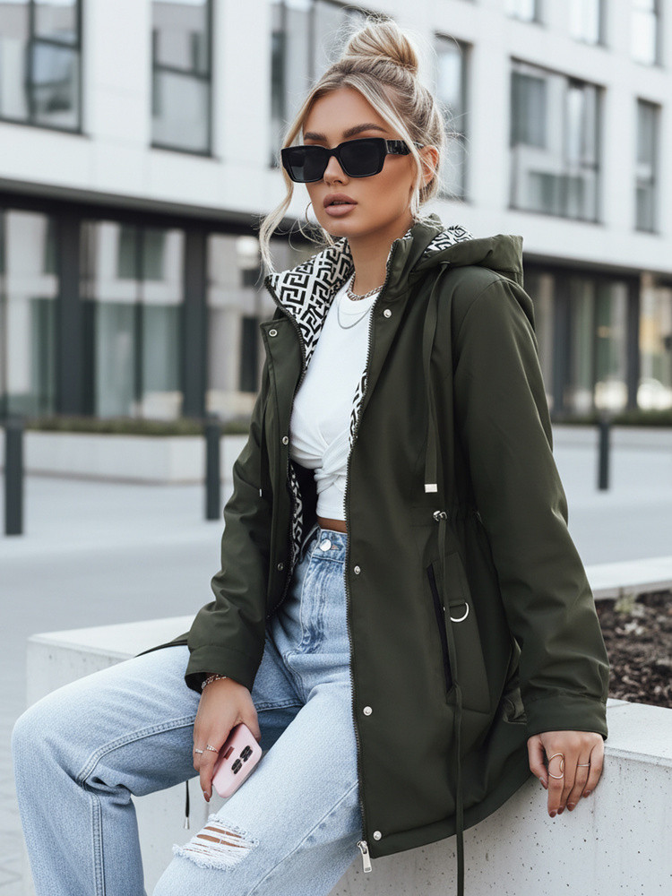 Stylowa parka damska w modnym odcieniu zieleni. Kurtka została zaprojektowana z myślą o komforcie i nowoczesnym stylu – idealna na sezon przejściowy oraz chłodniejsze dni. Posiada odpinany kaptur, praktyczne kieszenie oraz ściągacz w talii, który pozwala dopasować fason do sylwetki. Wnętrze kurtki zdobi modna, kontrastowa podszewka z geometrycznym wzorem.