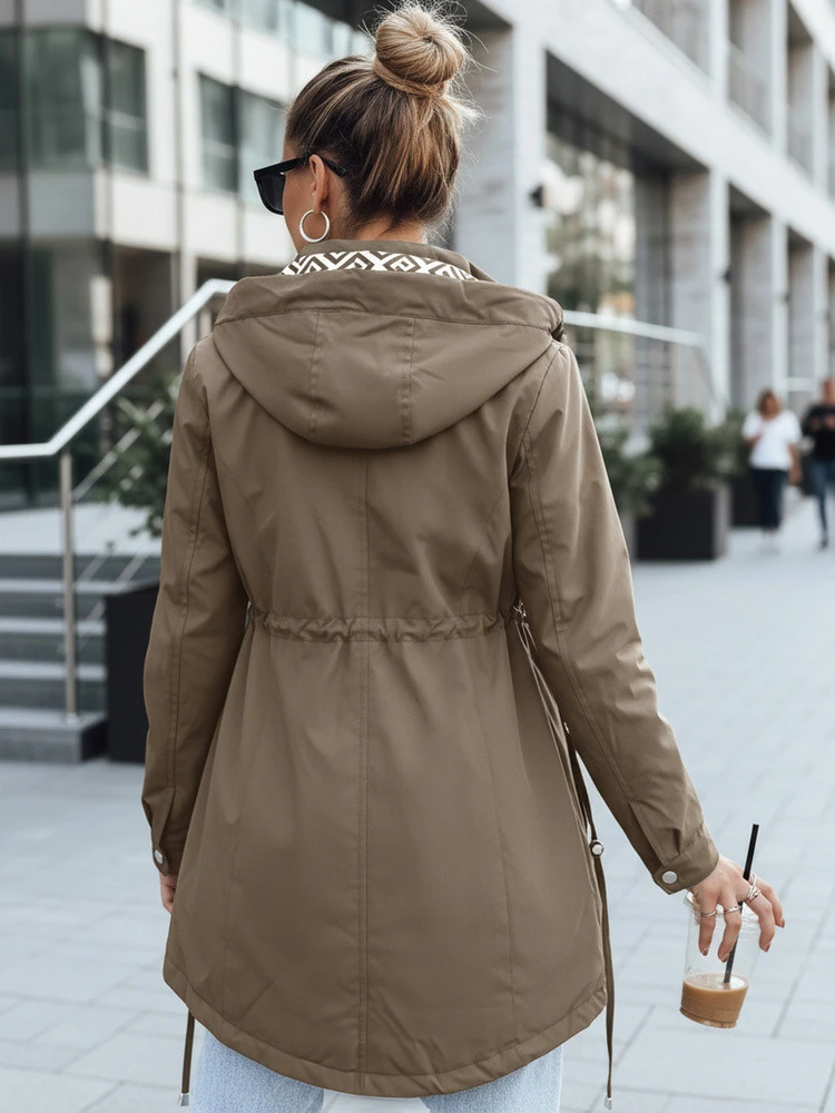 Stylowa parka damska w modnym kolorze khaki. Kurtka została zaprojektowana z myślą o komforcie i nowoczesnym stylu – idealna na sezon przejściowy oraz chłodniejsze dni. Posiada odpinany kaptur, praktyczne kieszenie oraz ściągacz w talii, który pozwala dopasować fason do sylwetki. Wnętrze kurtki zdobi modna, kontrastowa podszewka z geometrycznym wzorem.