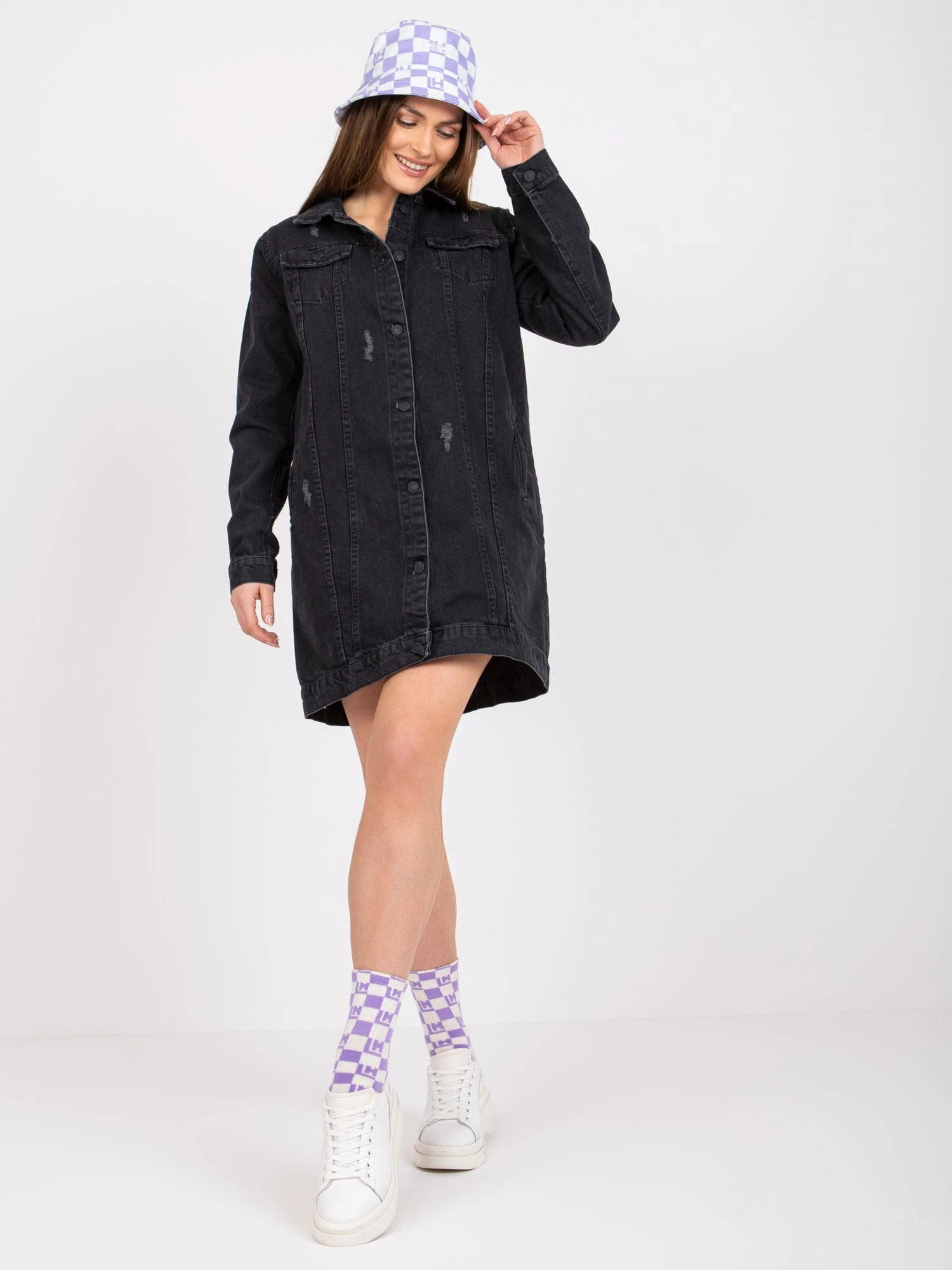 Modelka ma na sobie rozmiar S. Wymiary modelki: wzrost 170 cm, biust 93 cm, talia 66 cm, biodra 93 cm.