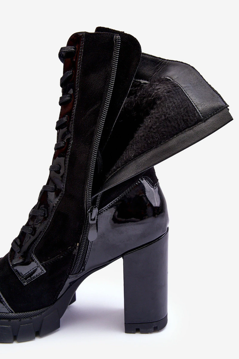 Boty ženské vyrobené z kombinace eko kůže a eko semiše. Na přední straně je šněrování a další zip na boku. Podpatka ve formě vysokého sloupku. Model s vyšším výstřihem. Vnitřek zateplený obuvním kožichem. Navíc je špička zesílena. Při výběru velikosti se řiďte tabulkou velikostí.